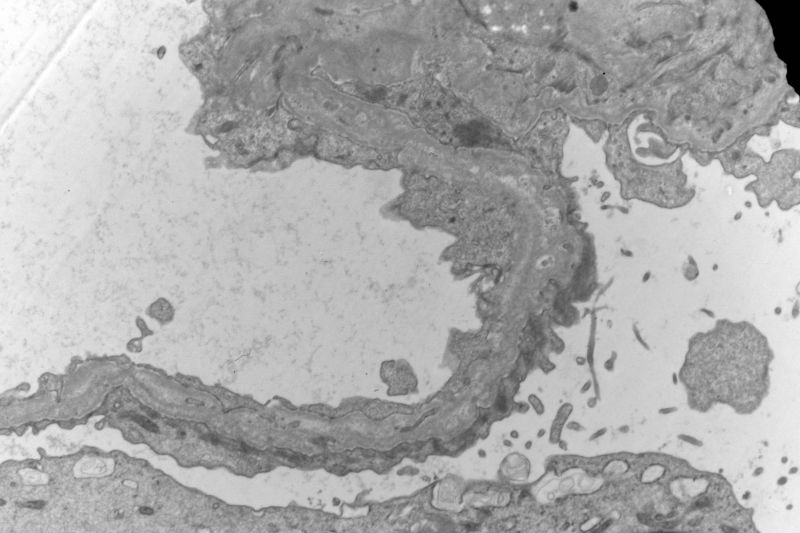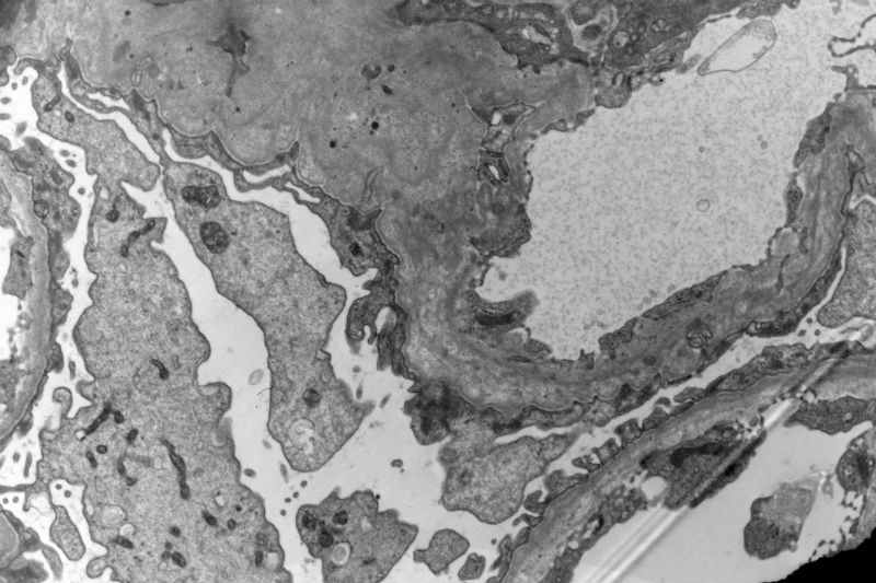 The patient has a long history of "chronic kidney disease". Initially, he did not tell the nephrologist that he started to have kidney disease decades ago. Given the characteristic ultrastructural changes, Alport's syndrome is suggested.