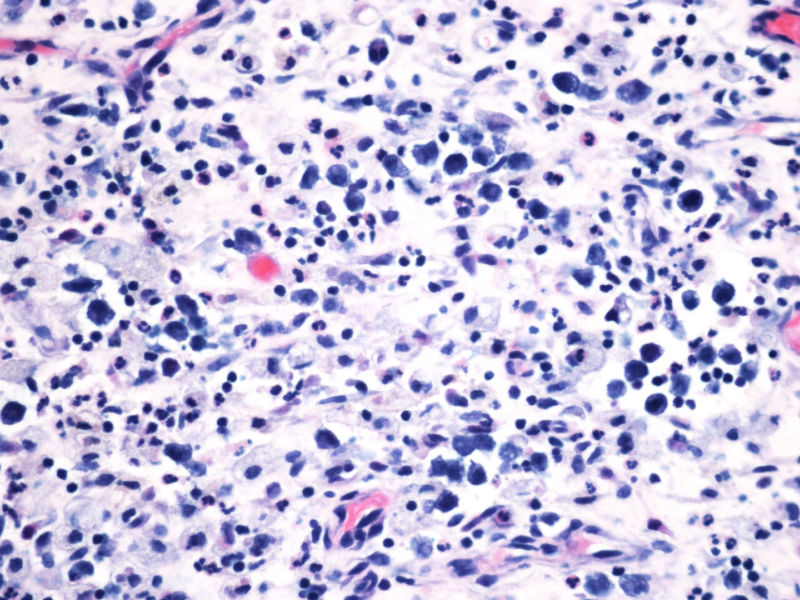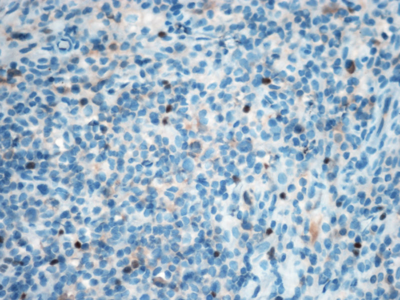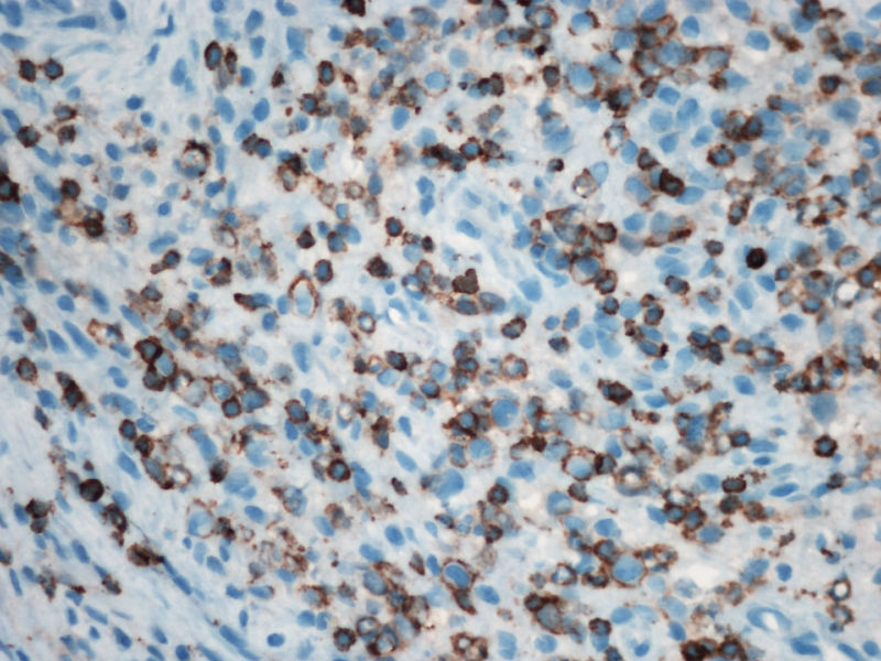形态学hallmark 细胞显示不是很清晰,大的肿瘤细胞如果在ALCL和HL之间选择可能不容易,但HL的肿瘤细胞形态学特点的范围比较狭窄,而ALCL可能具有更广泛的形态学范围,细胞大小形态以及典型hallmark cell的多少有时很难确定。如果只看HE,觉得ALCL的可能会安全一点,当然我个人经验不足,可能理解得比较肤浅。