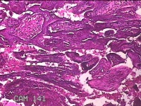 灰白暗红色不规则碎组织1.5x1.3x0.3cm一堆,内有少许绒毛样组织。