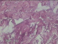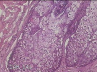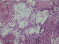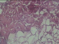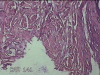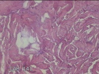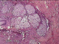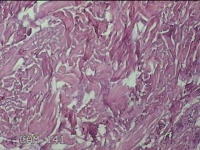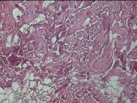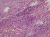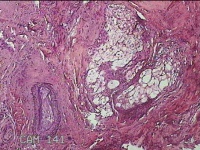 灰白暗红色组织1x0.7x0.3cm一块,表面带梭形皮肤1x0.5cm,皮下见结节0.9x0.7x0.3cm一个,切开结节呈实性,切面灰白暗红色,质中。