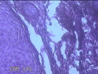 灰白暗红色肿物0.7x0.3x0.2cm一个,表面糜烂。