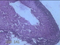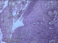 灰白暗红色肿物1.3x0.8x0.3cm一个,表面糜烂。