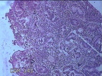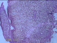 灰白粉红色不规则肿物1.5x1.3x0.2cm一堆,表面糜烂。