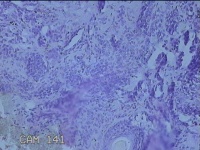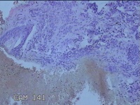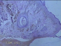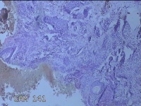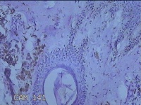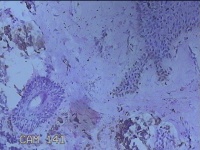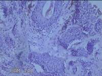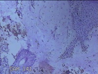 灰白暗红色肿物0.8x0.5x0.3cm一个,表面糜烂,起开肿物呈实性,切面灰白粉红色,质软。