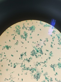 绝经13年,阴道出血一周,鲜红色,B超:宫颈多发囊肿。老师们,有些核深染细胞,有事吗?