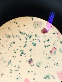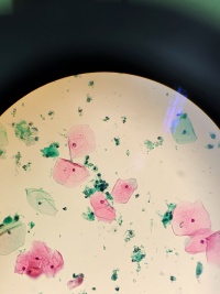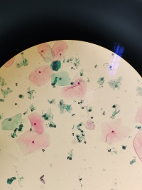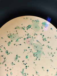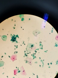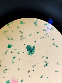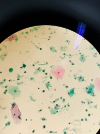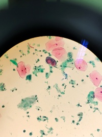 闭经4个月,阴道出血一月余,B超:宫腔内异常回声1cm。妊娠:阴性,HPV阴性。老师们,背景有些脏,有些核深染的小细胞,有事吗?