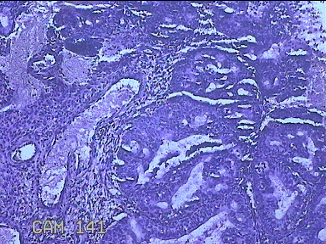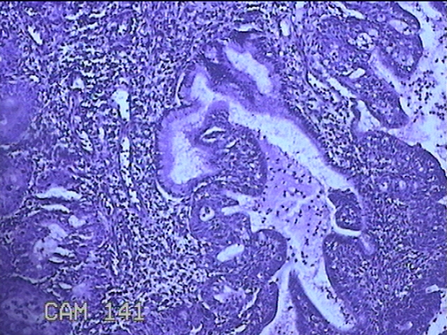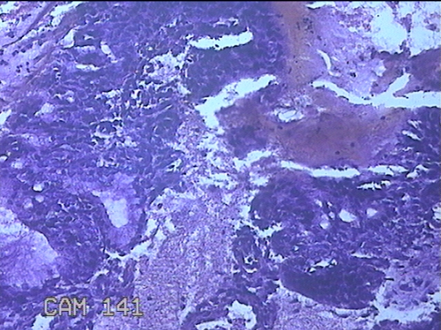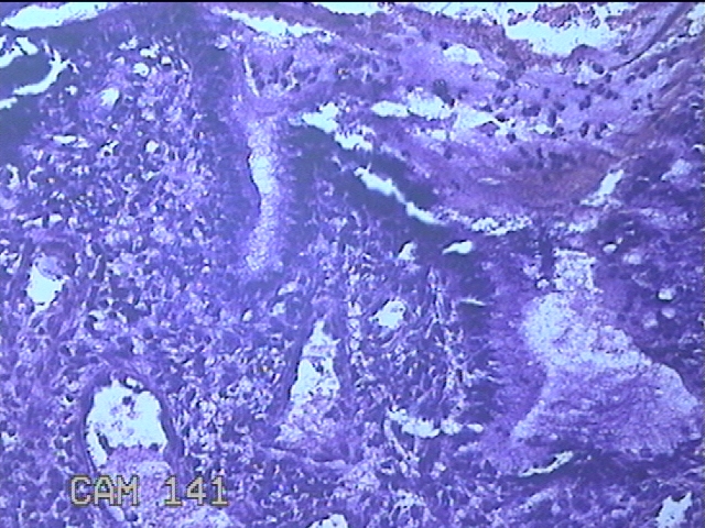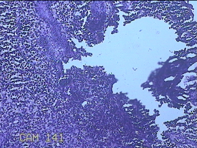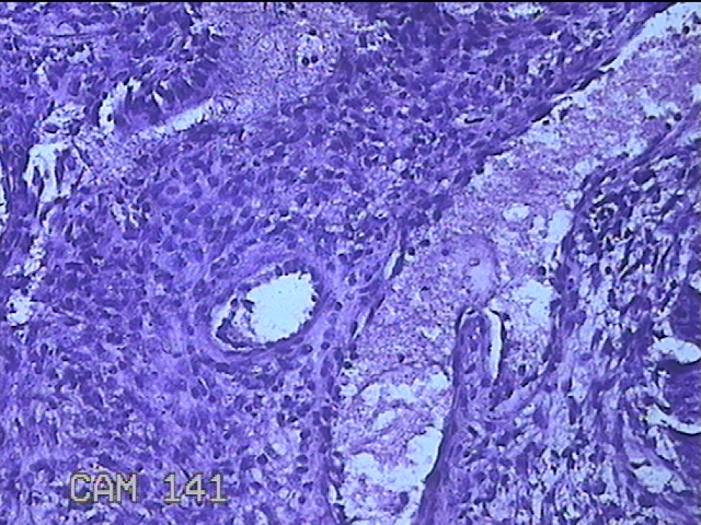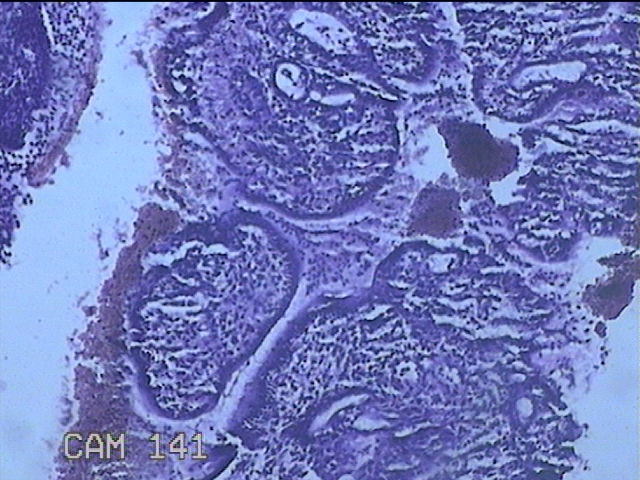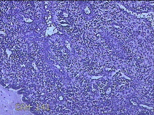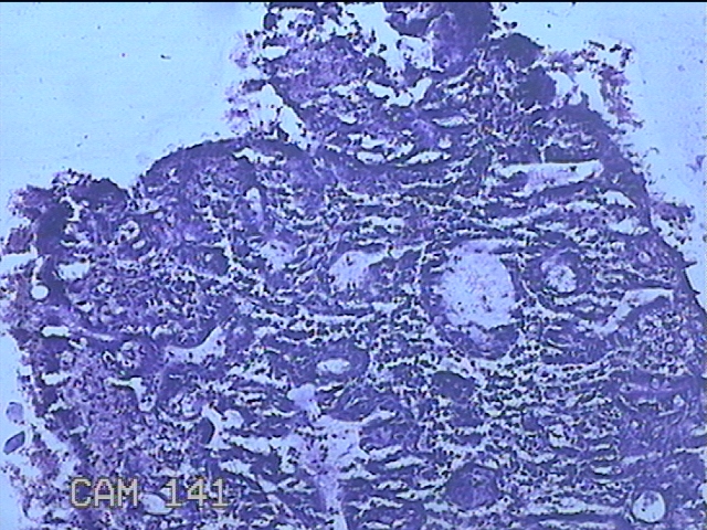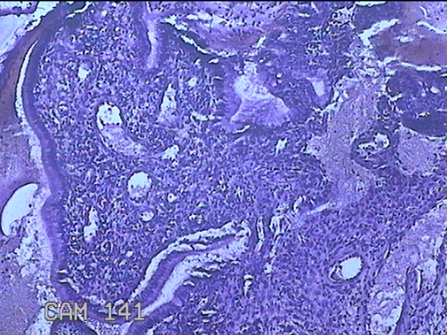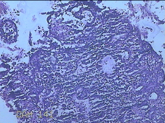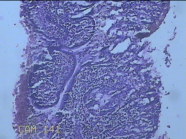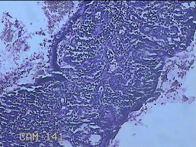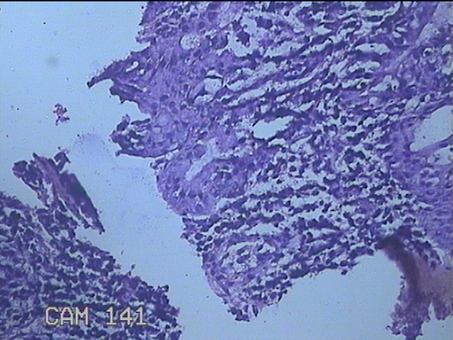 灰白暗红色肿物1x0.7x0.2cm一个,表面糜烂。