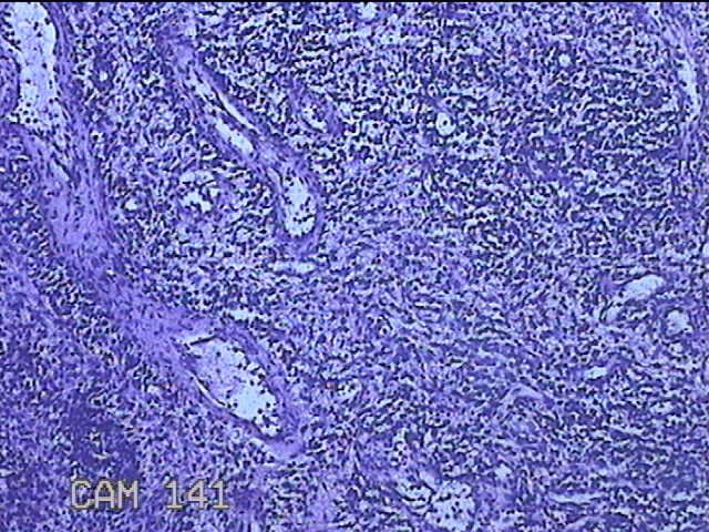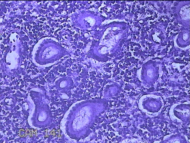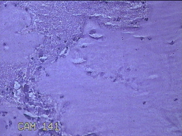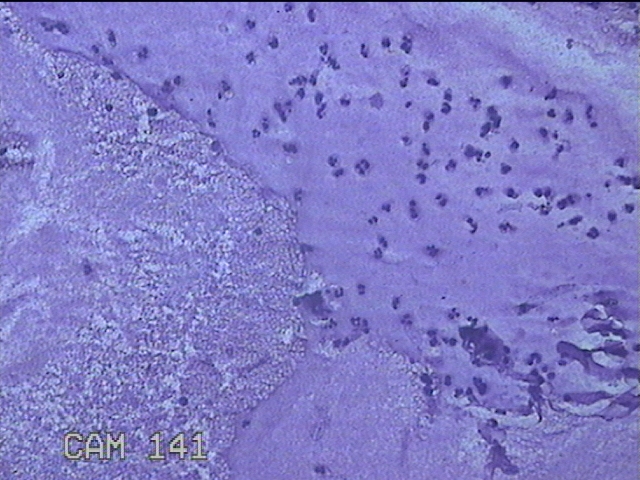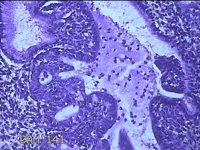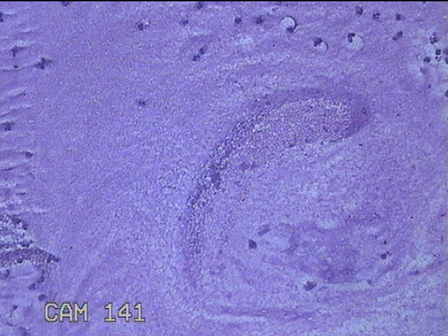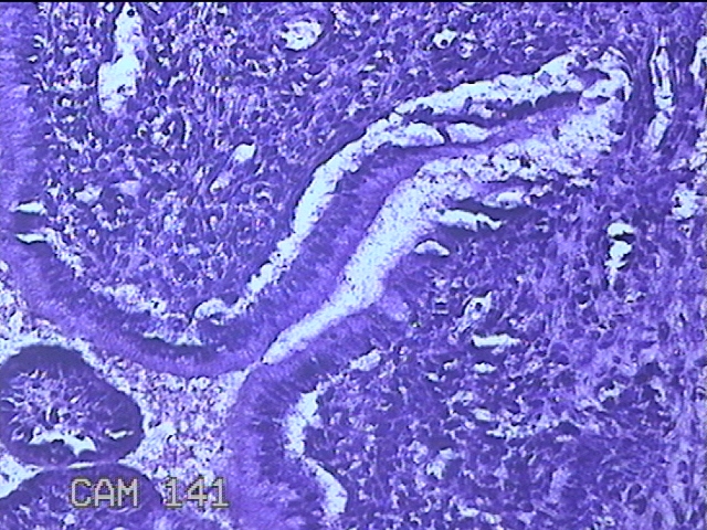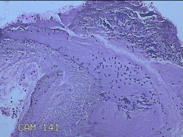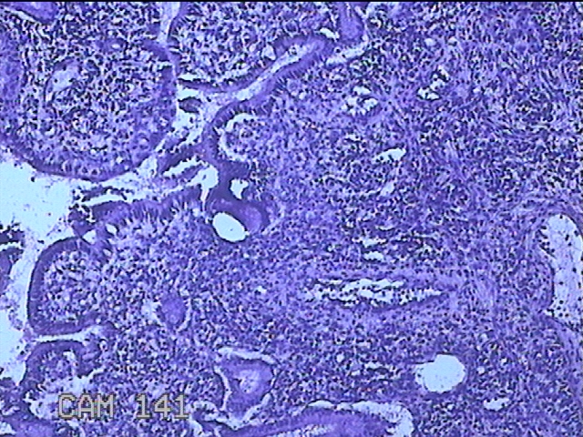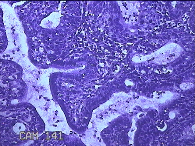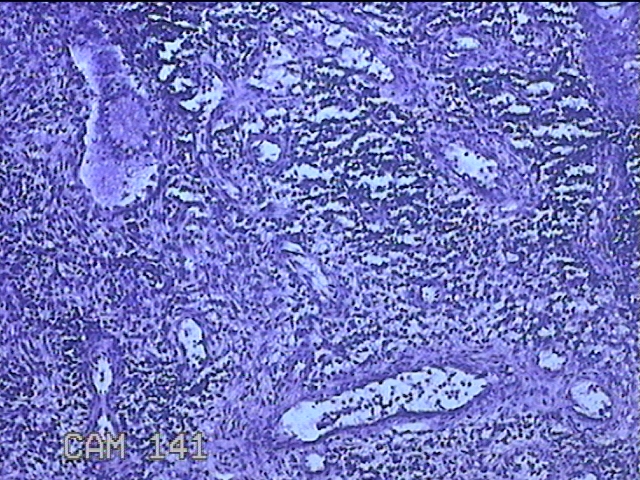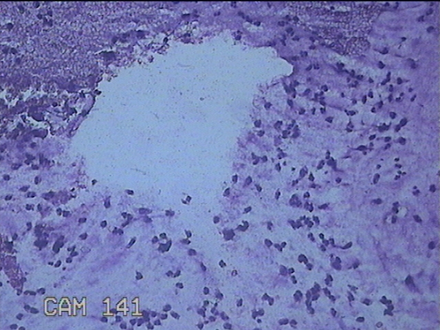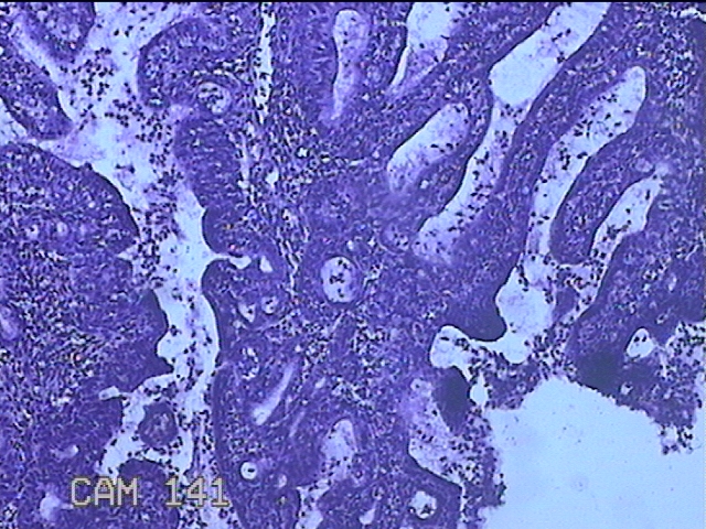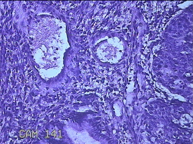 灰白暗红色肿物1x0.7x0.2cm一个,表面糜烂。