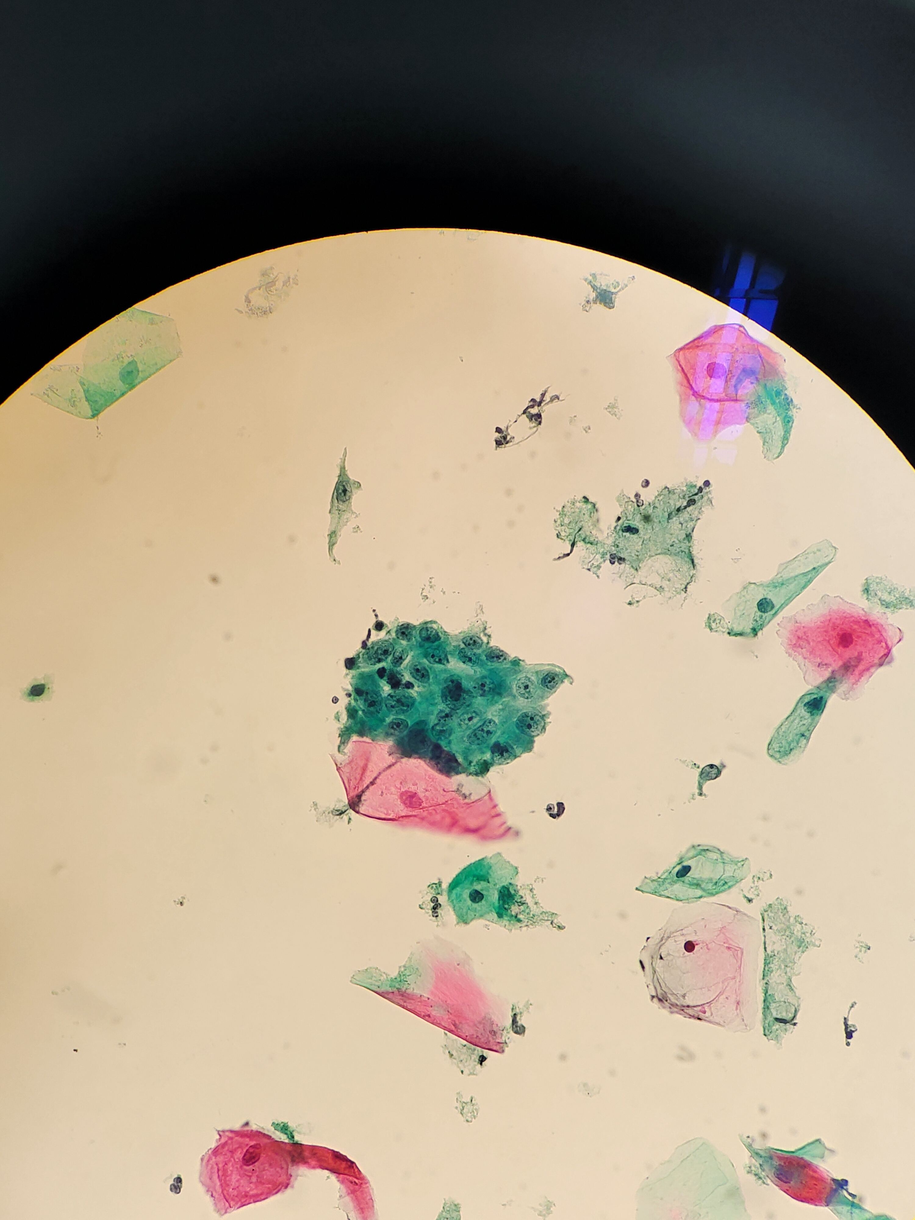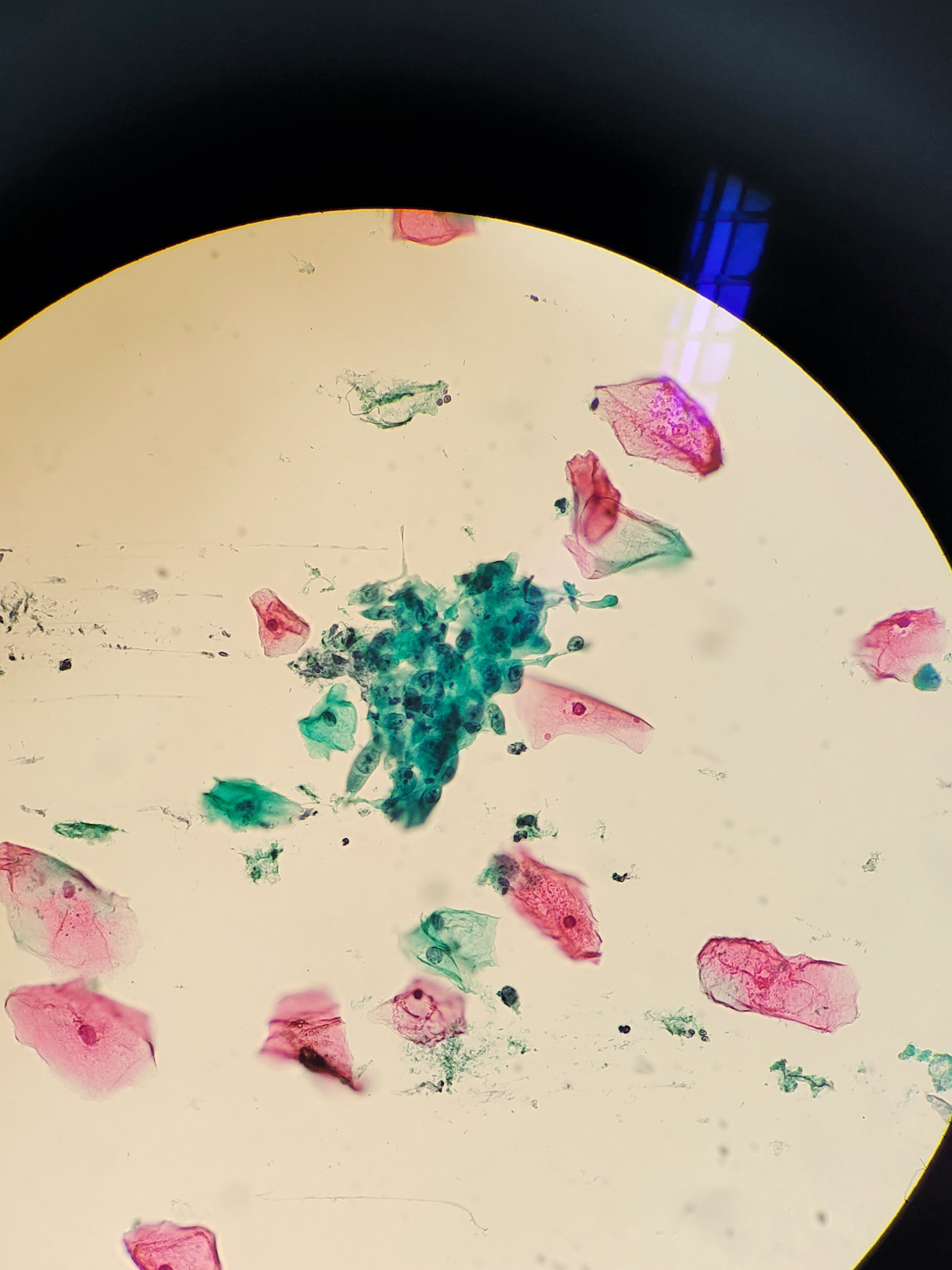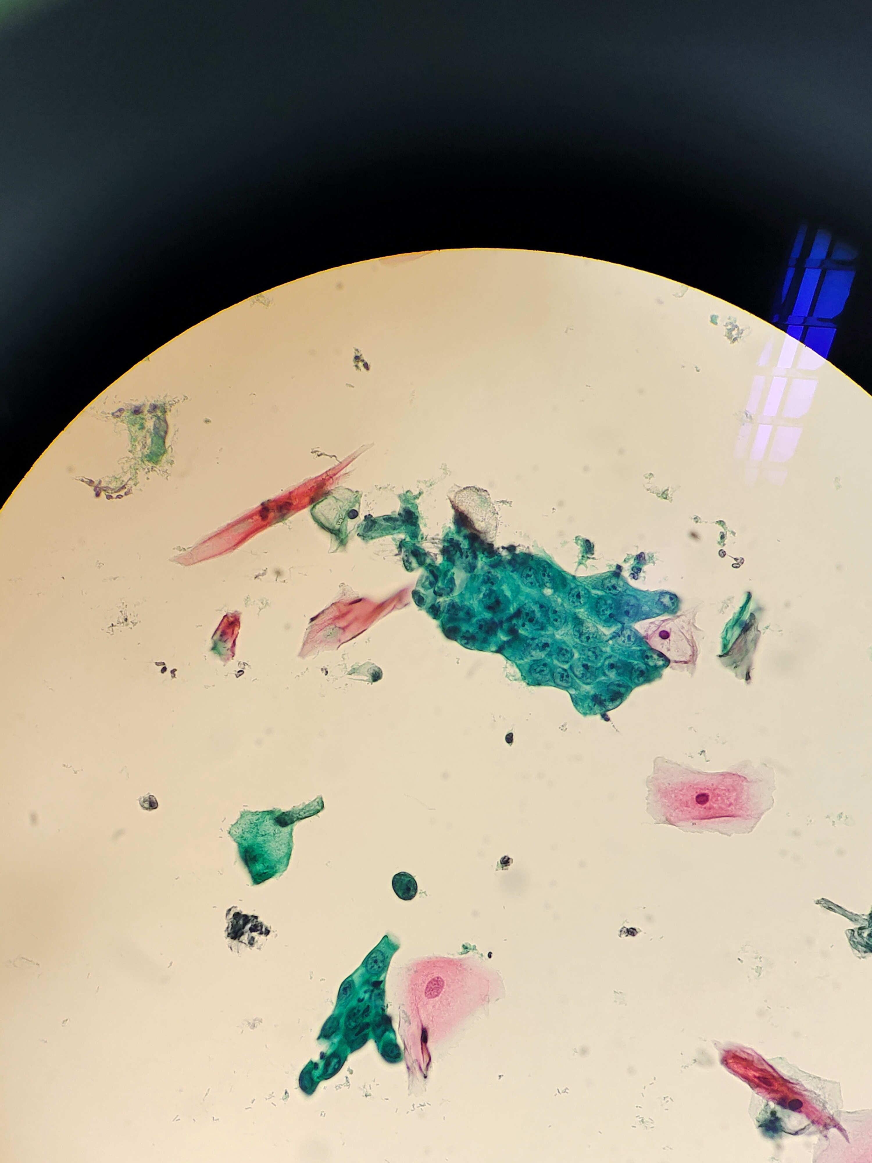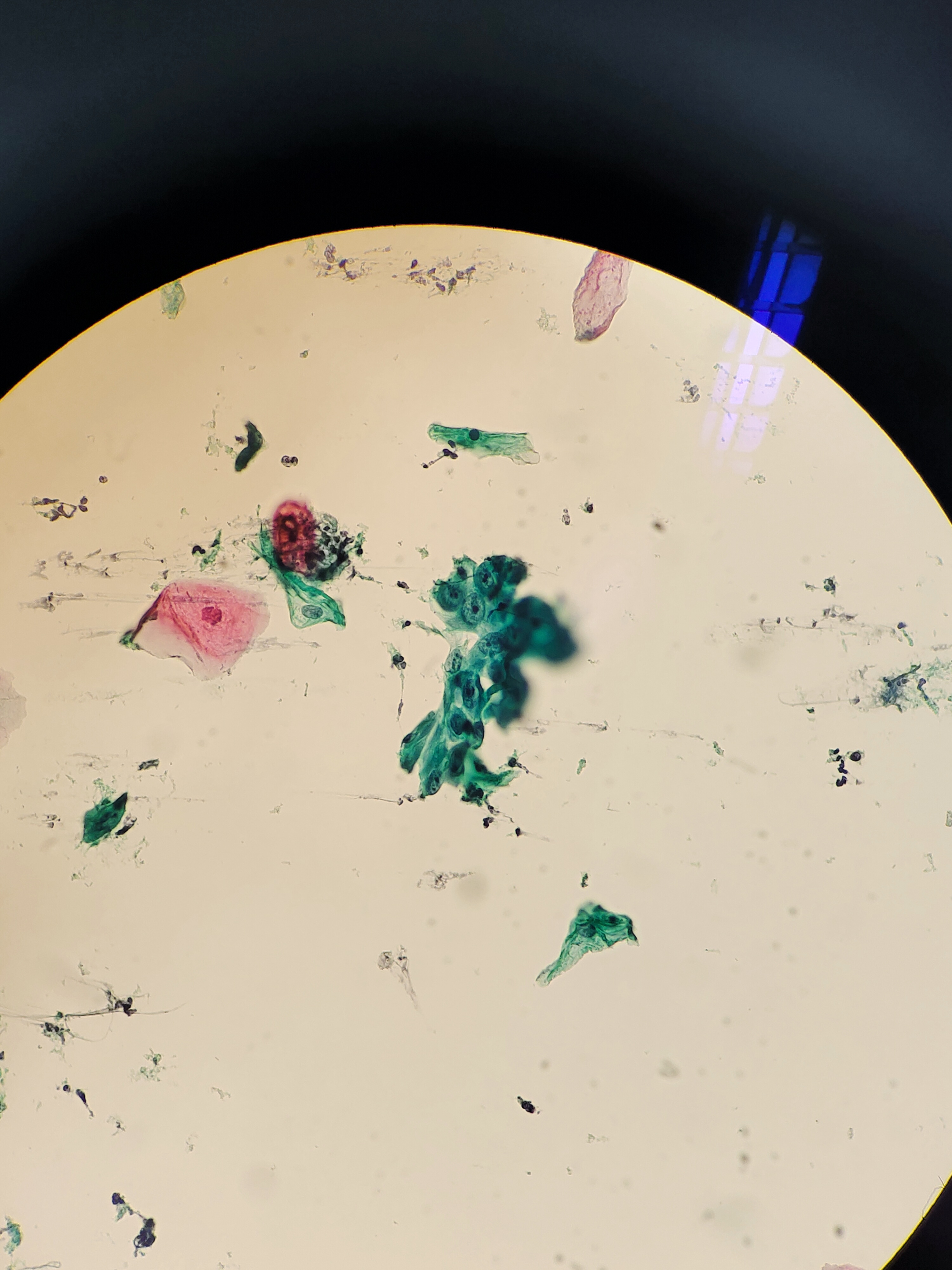阴道前壁脱垂3年,几年前曾行子宫部分切除术,自述因为子宫肌瘤,B超:子宫切除术后,盆腔未见明显异常。老师们,成团细胞,有些核大,有事吗?