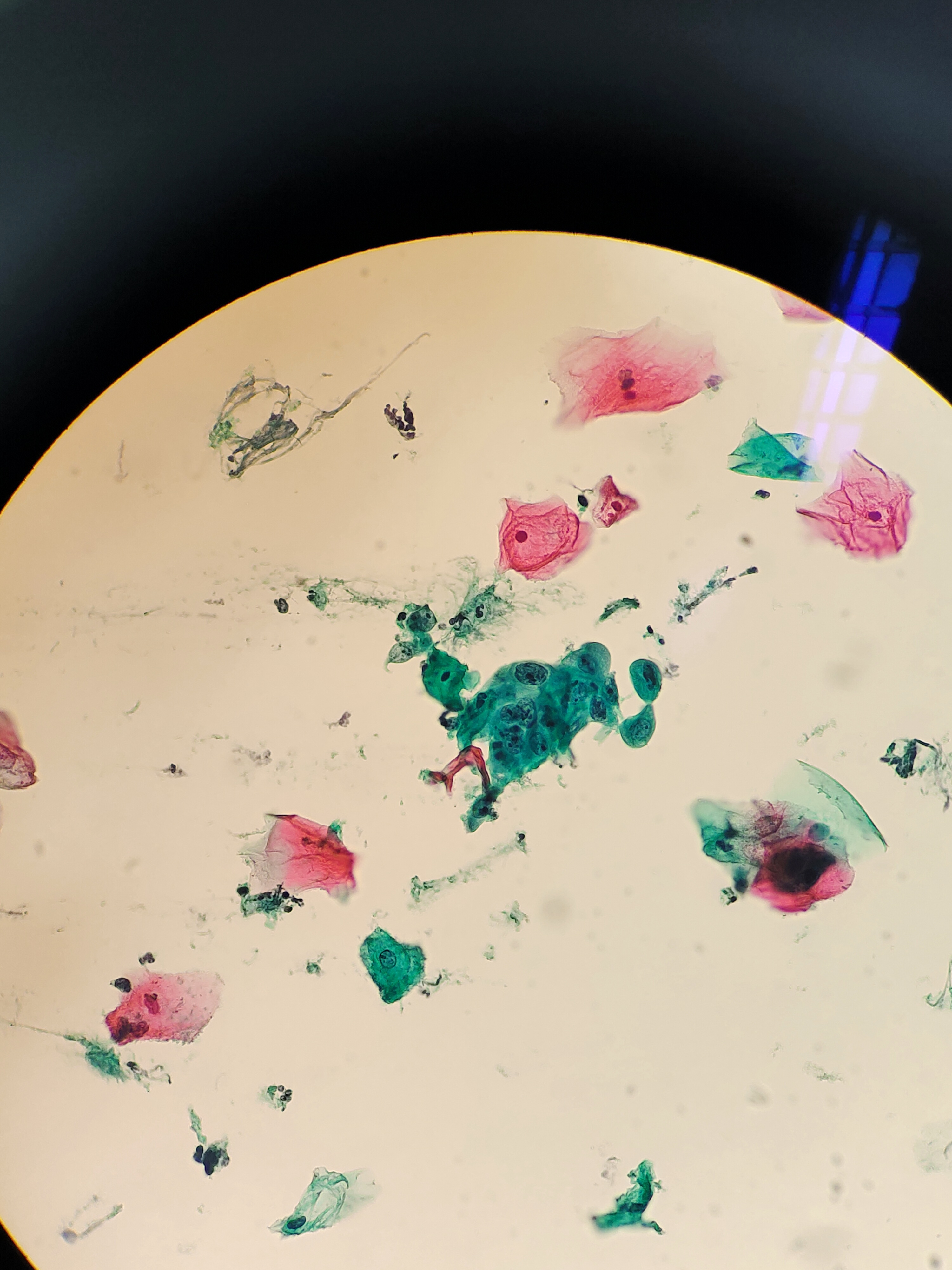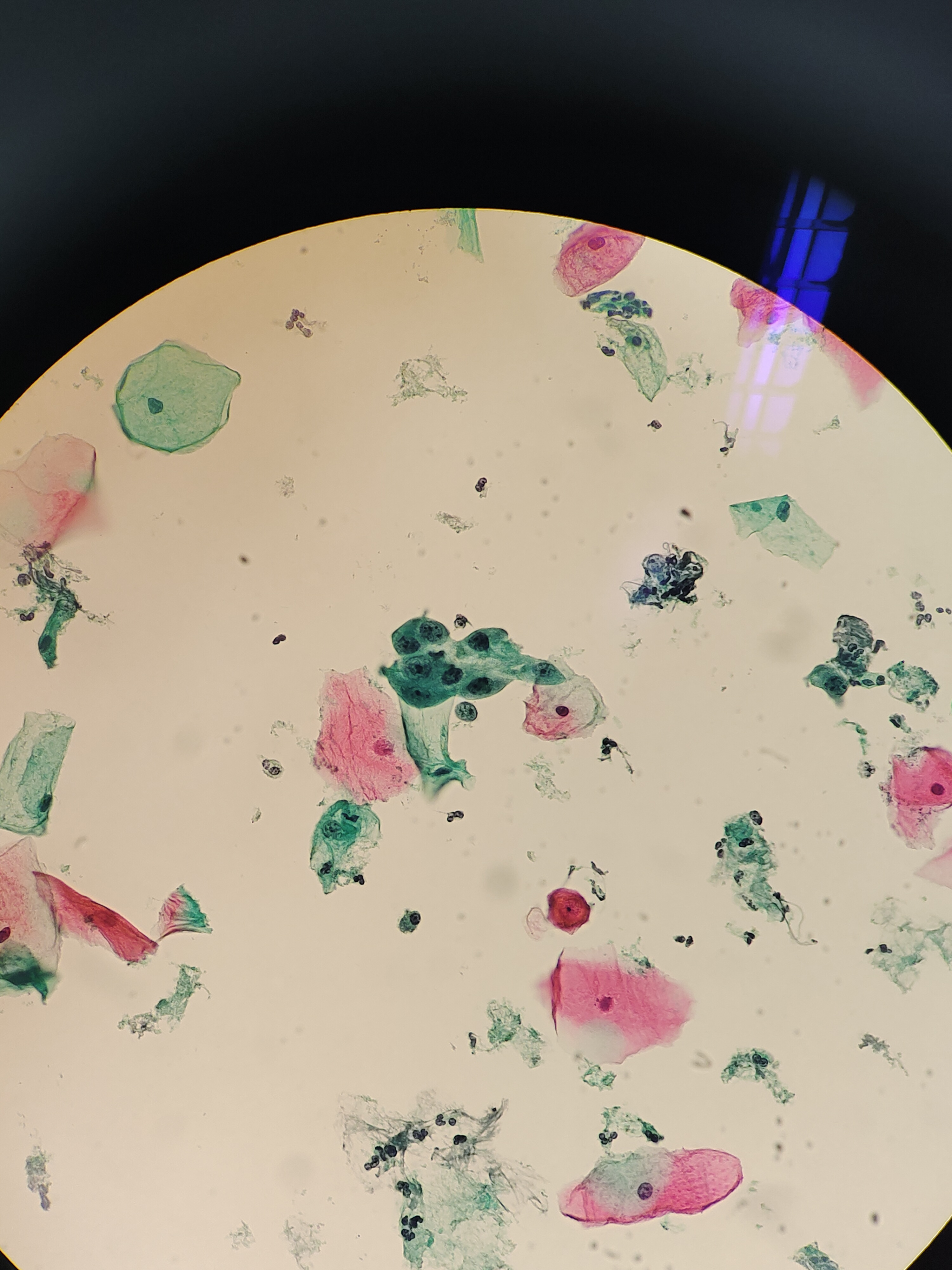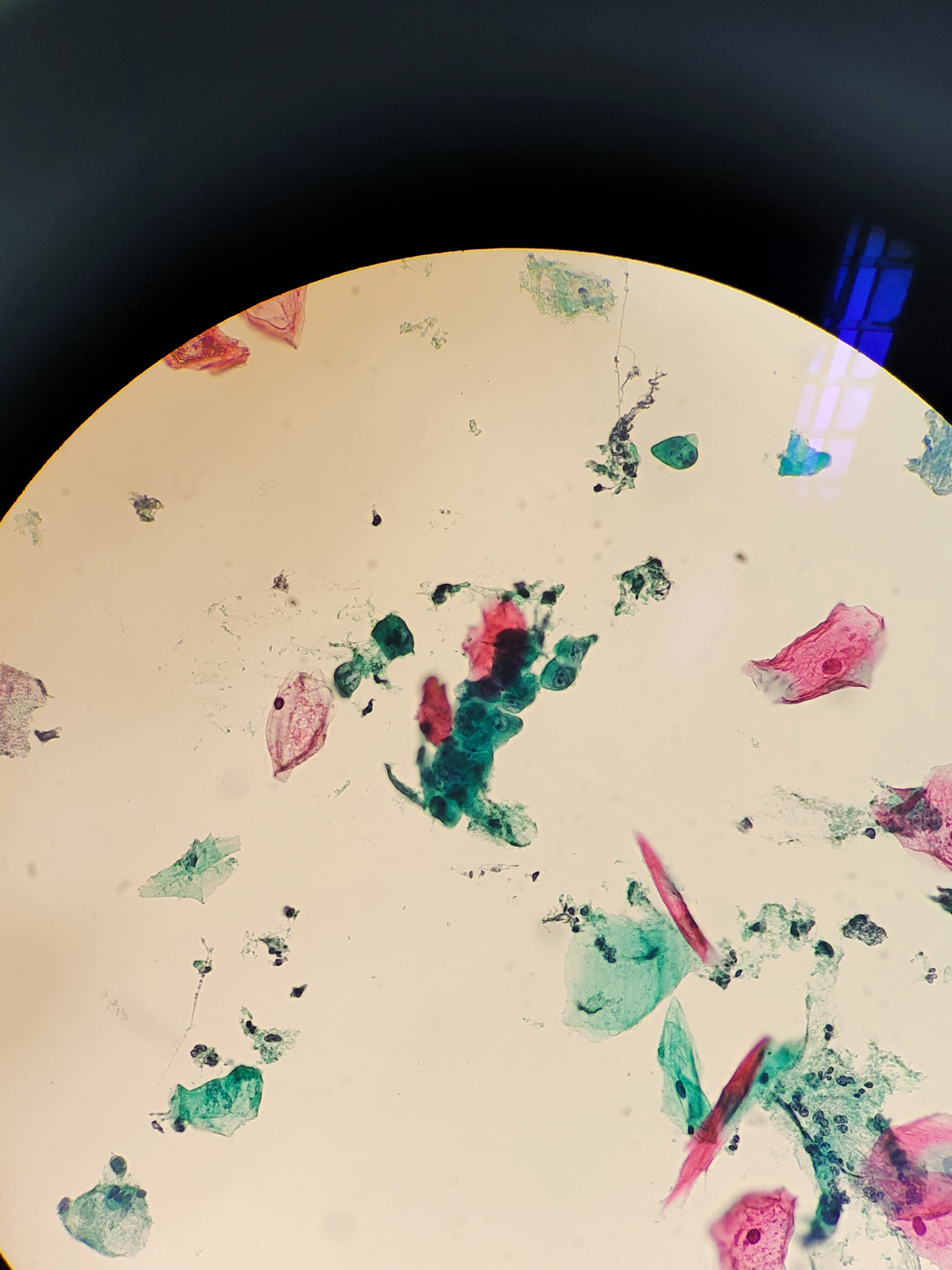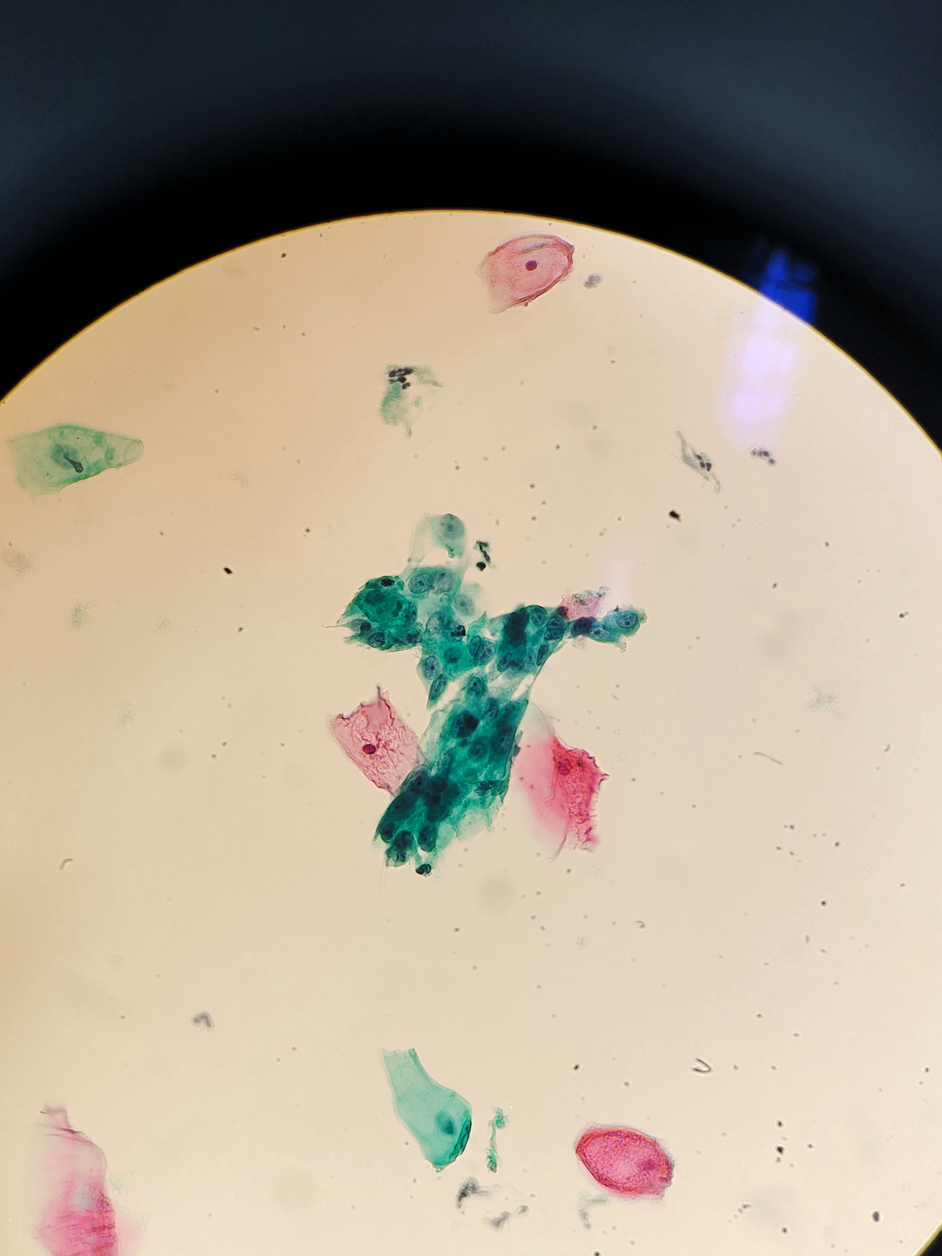 阴道前壁脱垂3年,几年前曾行子宫部分切除术,自述因为子宫肌瘤,B超:子宫切除术后,盆腔未见明显异常。老师们,成团细胞,有些核大,有事吗?