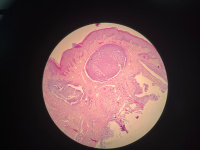 皮肤肿物一个,大小约2.2✖️1.6✖️0.7cm ,突出于皮肤,肿物表面灰红灰白,切面灰白,质略硬
