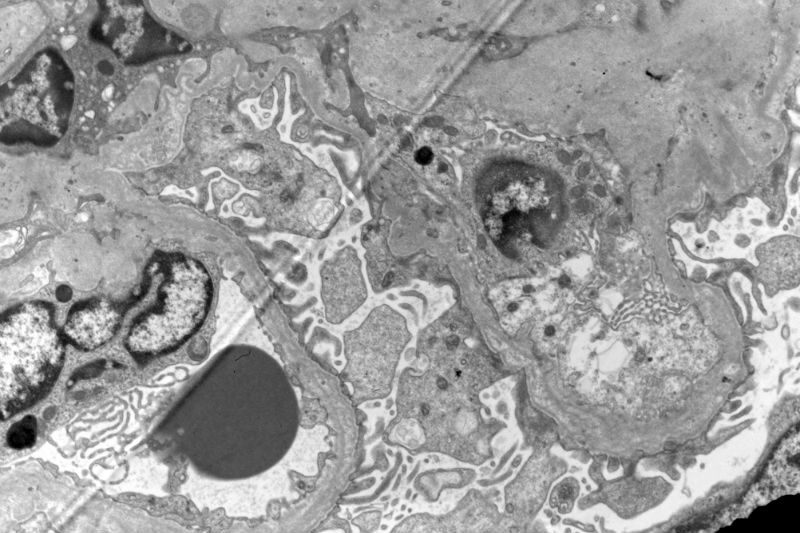 The patient has a long history of "chronic kidney disease". Initially, he did not tell the nephrologist that he started to have kidney disease decades ago. Given the characteristic ultrastructural changes, Alport's syndrome is suggested.