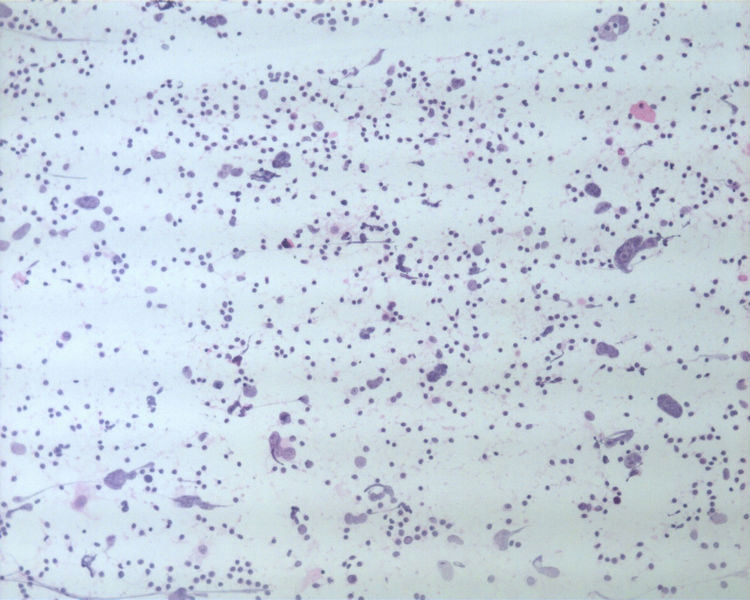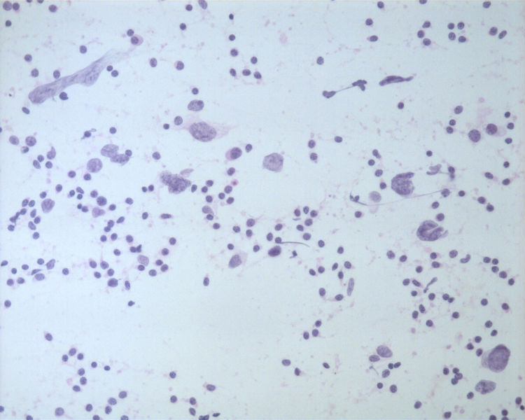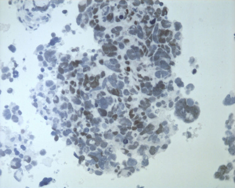 在细胞腊块没有出来前,我的确就首先考虑了肺的大细胞癌。因为核太大,太奇异。而染色质却相对比较均匀,而且部位又是在锁骨上,所以肺的大细胞癌的确是应该首先考虑。除了大细胞癌外,还有可能就是肺的肉瘤样癌,但后者缺乏一些梭形的肿瘤细胞。