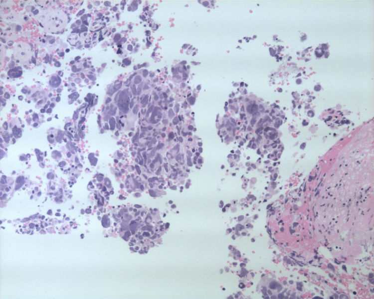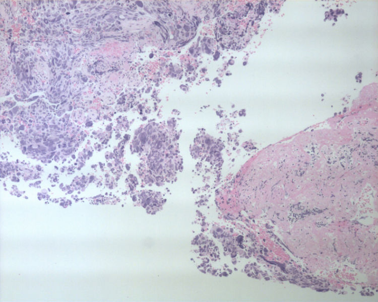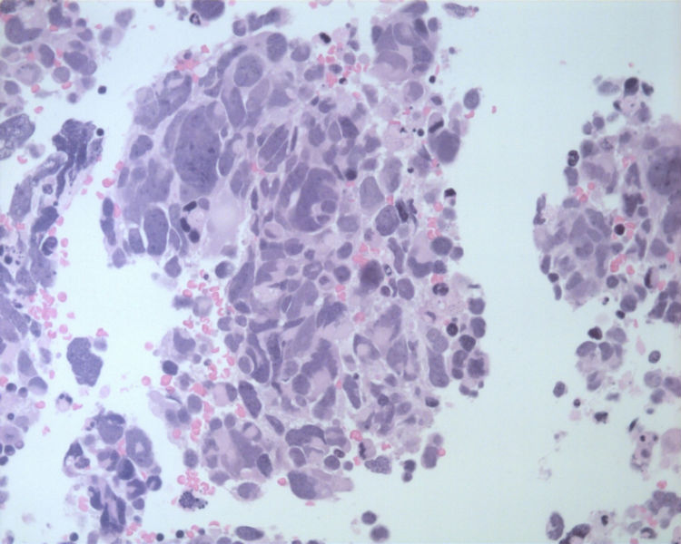 在细胞腊块没有出来前,我的确就首先考虑了肺的大细胞癌。因为核太大,太奇异。而染色质却相对比较均匀,而且部位又是在锁骨上,所以肺的大细胞癌的确是应该首先考虑。除了大细胞癌外,还有可能就是肺的肉瘤样癌,但后者缺乏一些梭形的肿瘤细胞。