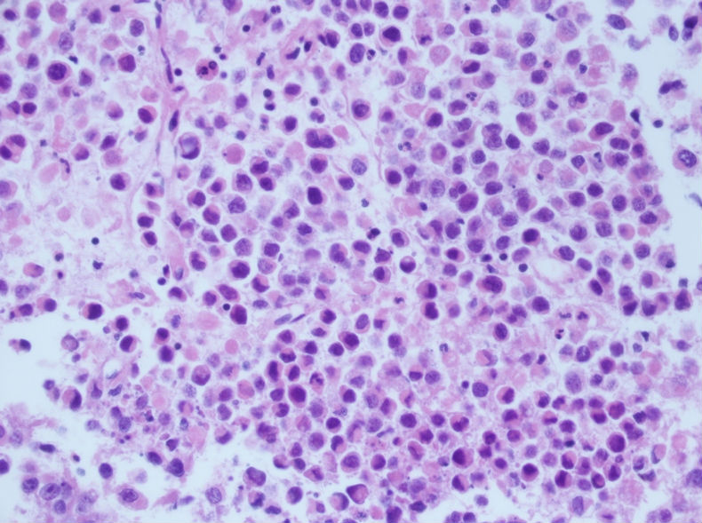 2、恶性黑色素瘤:这个部位,这样的细胞形态,恶黑与精原细胞瘤一样,是重点考虑对象,我没法区分两者应该谁考虑在前头。