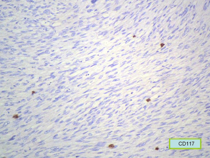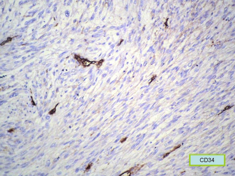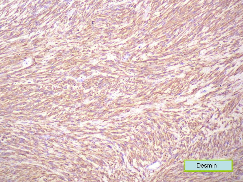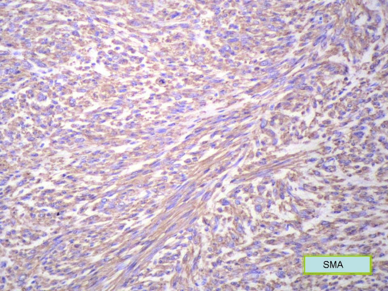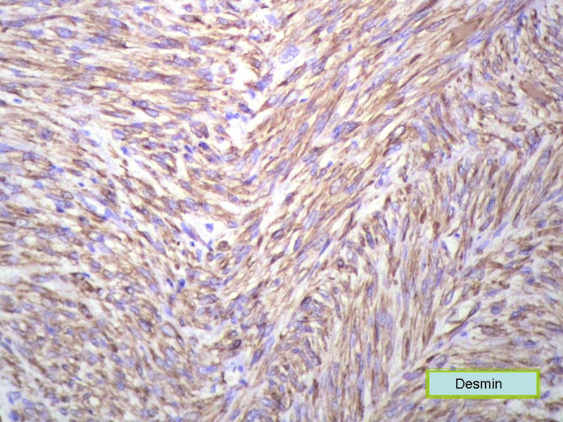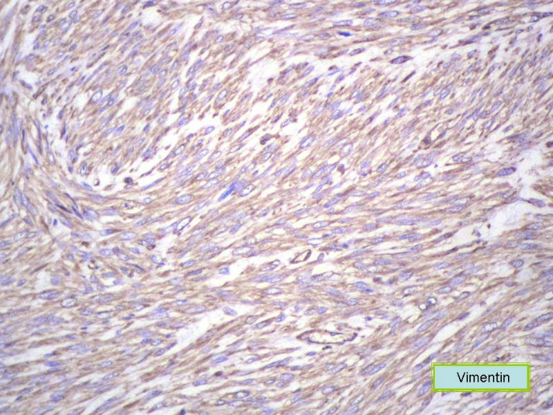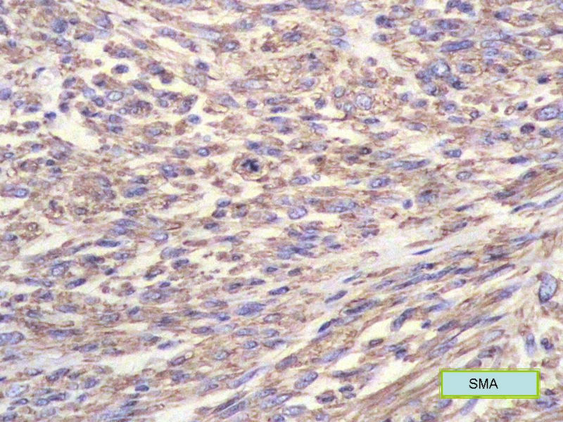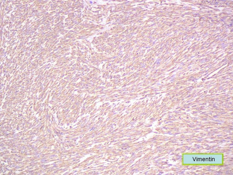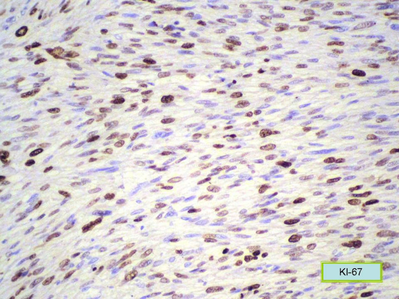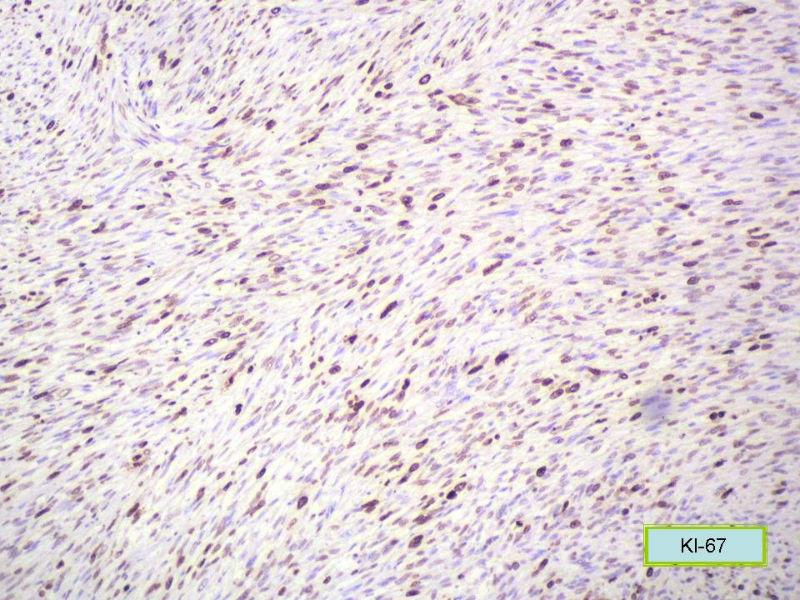 4、瘤细胞梭形,有明显的异型性,可见核分裂像。
