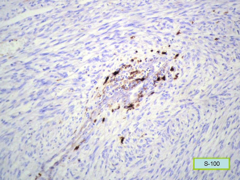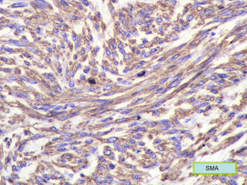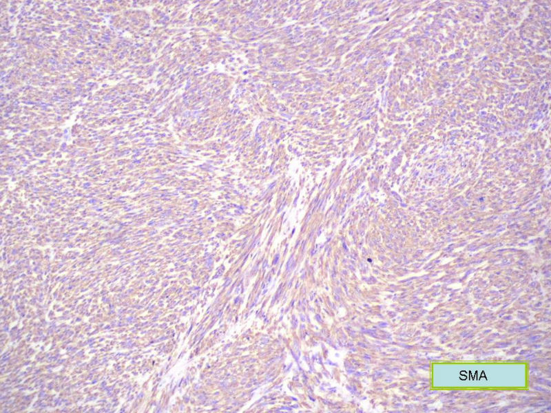 3、肿瘤细胞束状、编织状排列,部分区间质粘液变性;