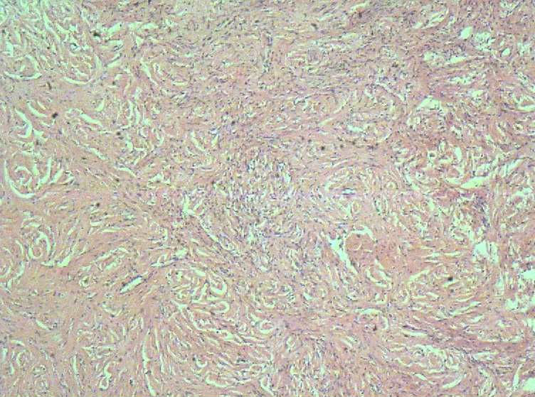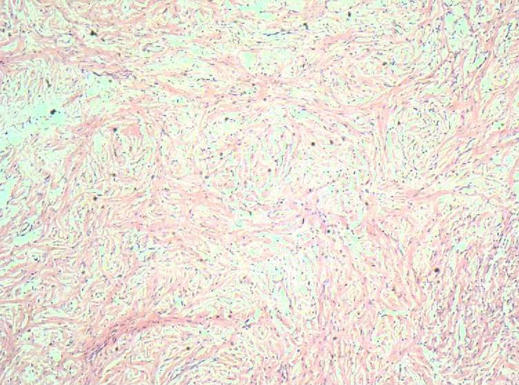 良性梭形细胞肿瘤,待做特殊染色定纤维瘤或卵泡膜细胞瘤。