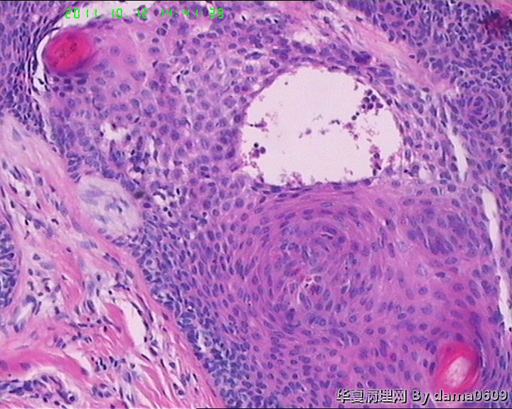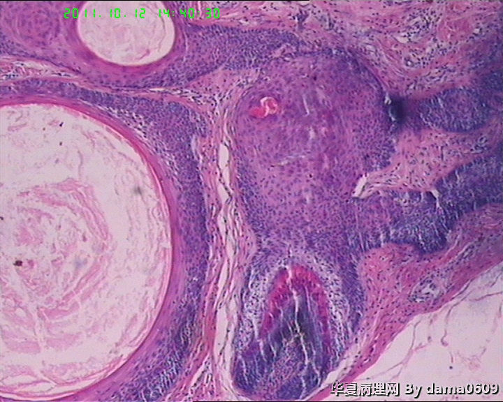 皮肤及附属器的肿瘤学生见得少,这一例发病部位和大体上符合“毛发上皮瘤”,但静下上好像要求由两层基底样细胞条索样排列和增生的间质构成,具体记不清了,也不知道对不对,我这例不见那样的典型结构啊!!