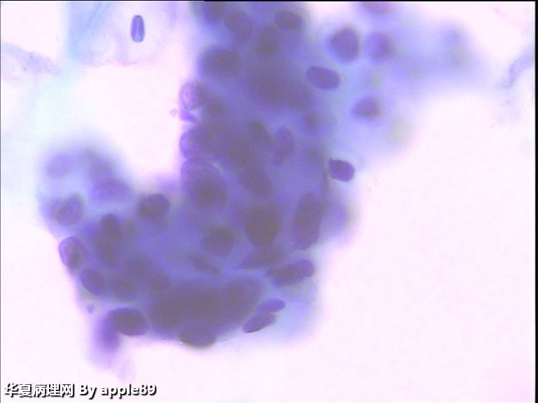 细胞异型,高核浆比,部分细胞漏核,但染色淡,细腻,核膜光滑。