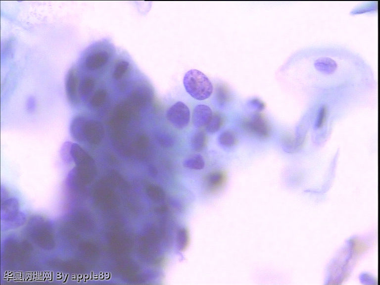 细胞异型,高核浆比,部分细胞漏核,但染色淡,细腻,核膜光滑。