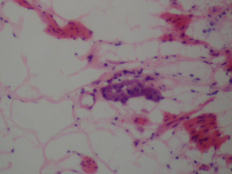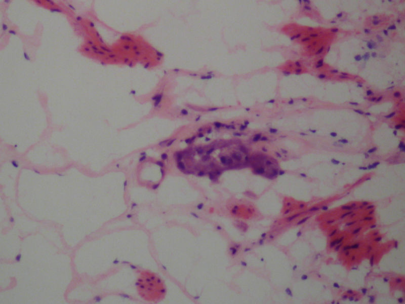 直肠中分化腺癌。送检下切缘做冰冻,请教片子里面这些小团细胞是什么细胞?