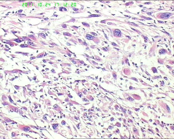 梭形细胞,异型性明显,可见多核巨细胞,胞质红染,似有横纹肌样分化,部分细胞可见胞质粘液,有核内假包涵体,所给的图像分裂相很少,结合大体,考虑低度恶性肿瘤。