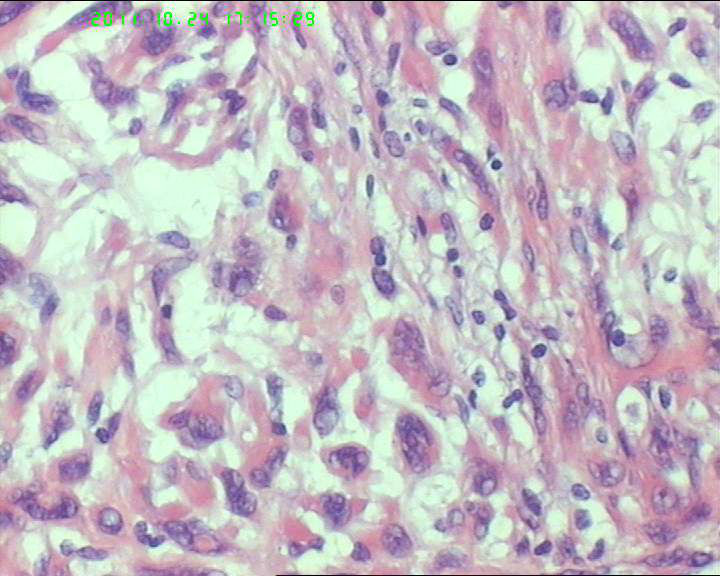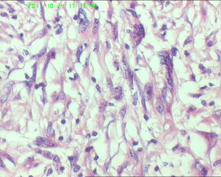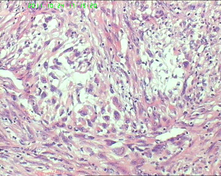 梭形细胞,异型性明显,可见多核巨细胞,胞质红染,似有横纹肌样分化,部分细胞可见胞质粘液,有核内假包涵体,所给的图像分裂相很少,结合大体,考虑低度恶性肿瘤。