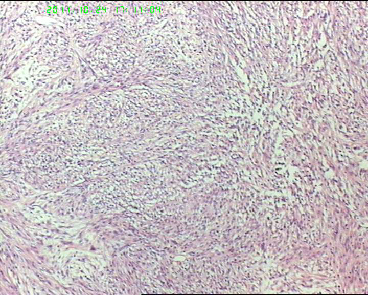 灰红肿物一个,大小6.5*3.5*3cm。包膜完整,切面灰白实性质韧。