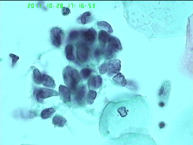 典型的HSIL,但坏死背景明显,可考虑SCC.