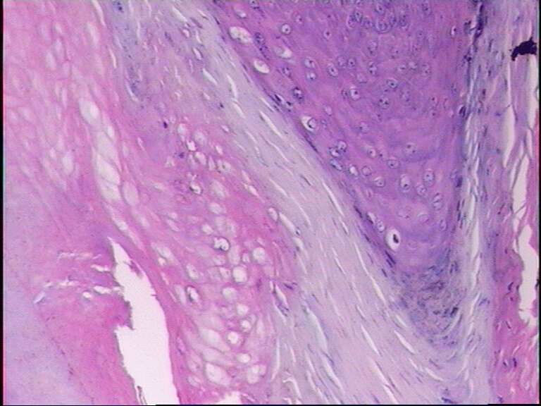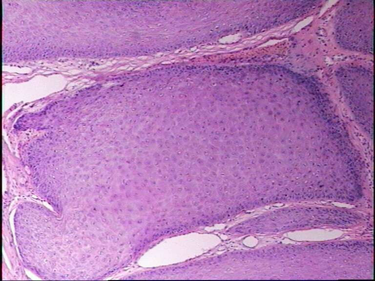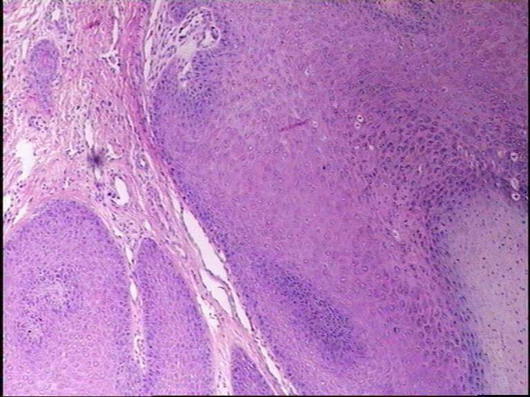 镜下 表皮棘层增生,颗粒层增厚,角化亢进及角化不全,真皮乳头瘤病。颗粒层细胞空泡变性,其核内或胞质内有均质性嗜酸性蛋白小体形成,周围有空晕。角化不全的细胞科堆积成小山包样外观。