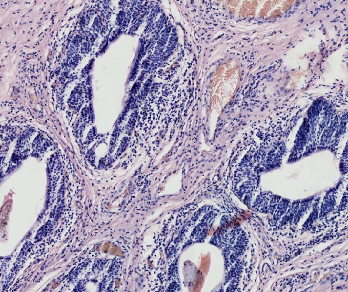 上皮下间质中有淋巴细胞浸润,移行上皮巢团中央有柱状上皮围成的腺样腔隙。诊断:腺囊型尿道炎。