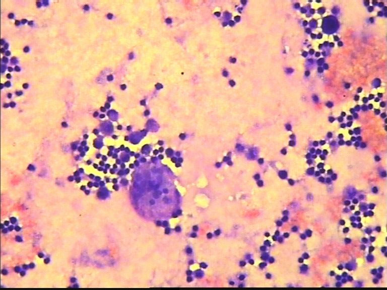 染色过深,固定不及时。那个核浆比高的细胞是异物还是细胞啊?不好判断。