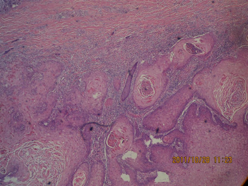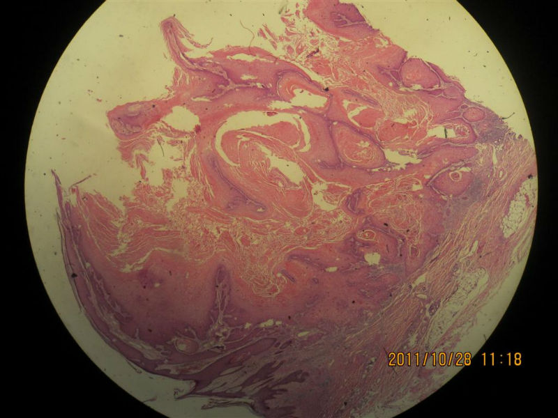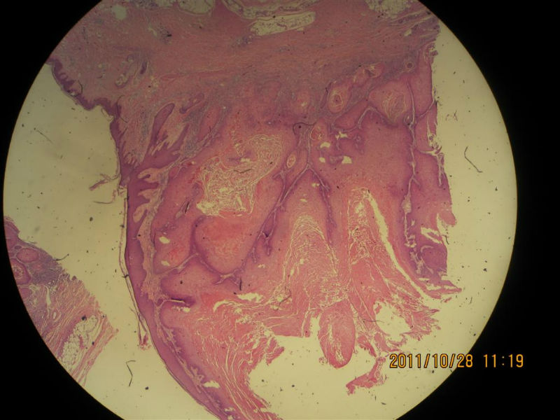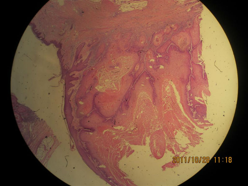 低倍镜见表皮呈火山口样,内充满角质团块,周边上皮增生呈衣领样,底部表皮增生呈假上皮瘤样,上皮角不规则延伸至真皮,真皮大量炎细胞浸润.