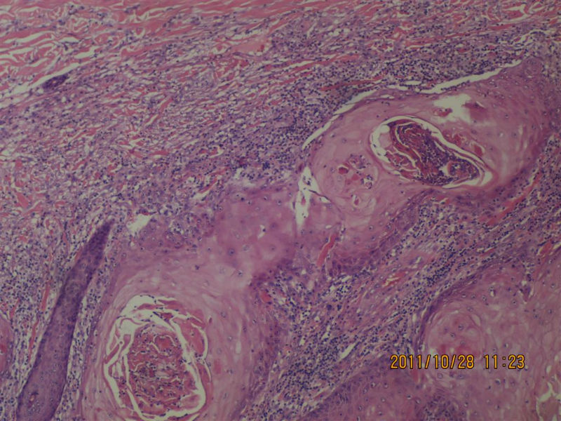 低倍镜见表皮呈火山口样,内充满角质团块,周边上皮增生呈衣领样,底部表皮增生呈假上皮瘤样,上皮角不规则延伸至真皮,真皮大量炎细胞浸润.