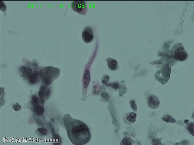 这个病例很典型,特别是标本来源为支刷,没有上呼吸道中的大量鳞状上皮干扰,这些角化的,梭形的,怪异的肿瘤细胞可以肯定为鳞癌来源。