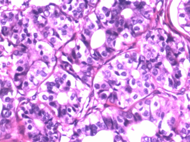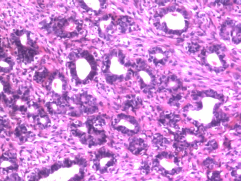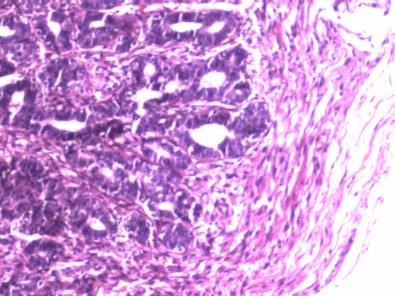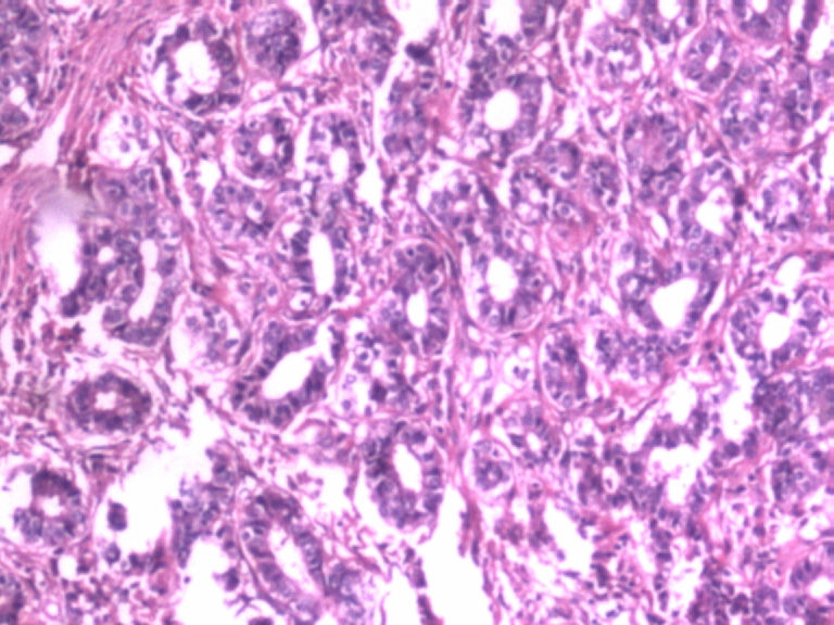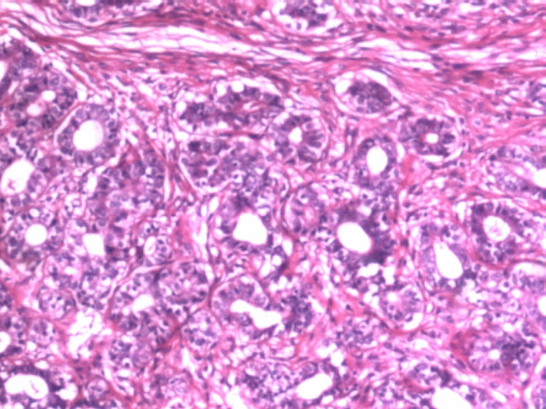 本例似乎有肌上皮存在,那就可能是良性的,如果有包膜就是腺瘤,管状腺瘤。