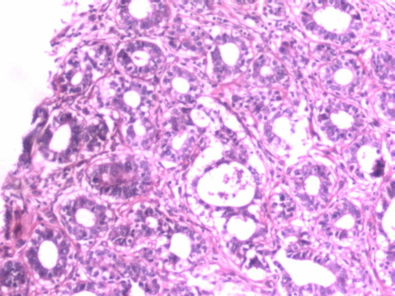 病变组织小叶结构未见,见管状、盲管状的腺管,周围似有空亮的肌上皮,腺上皮可见细小的核仁,染色质均细,导管上皮普通型增生。有包膜为盲管状腺瘤,则为腺病。