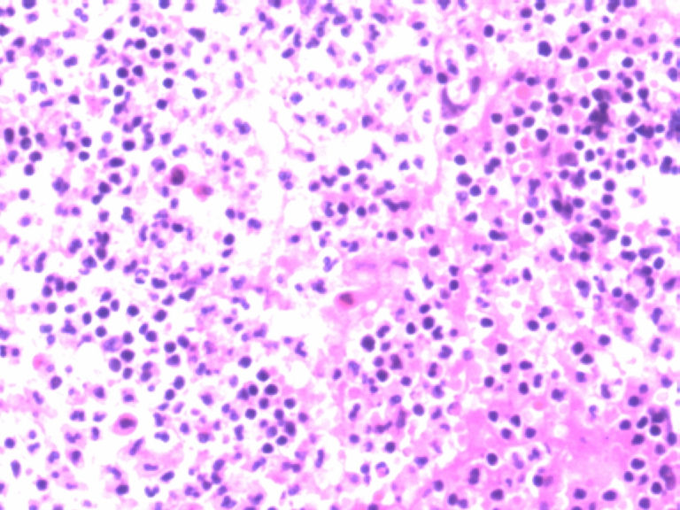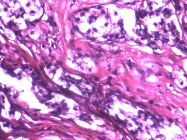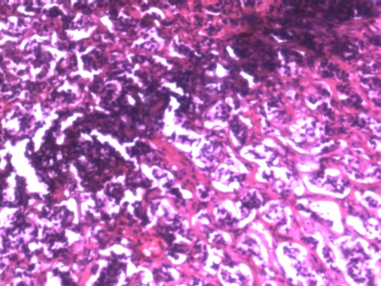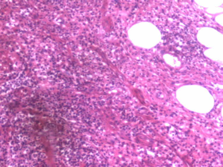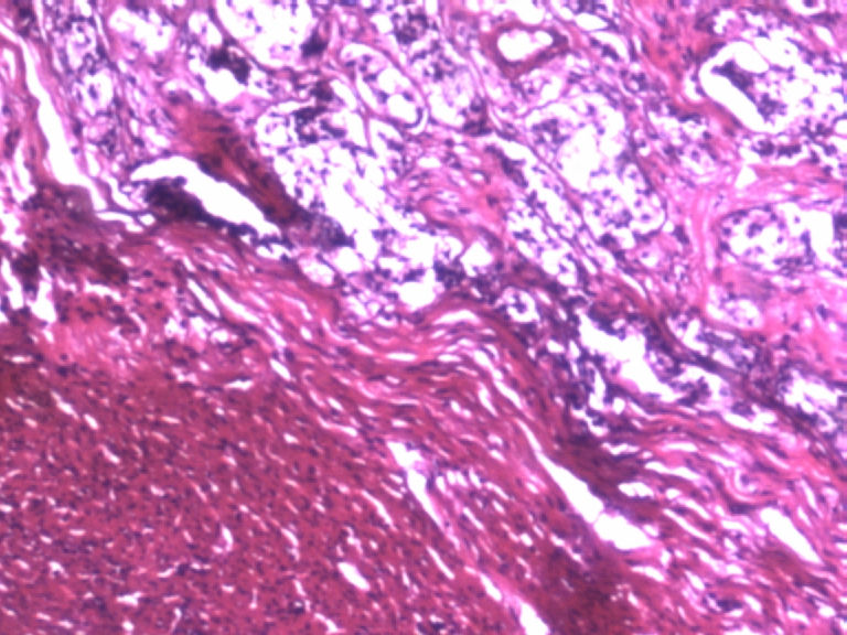 男,50岁,阑尾长7厘米,直径0.4---0.6厘米。剖开:尖端看见淡黄色区,不规则,界限欠清,0.15*0.2厘米,质中。
