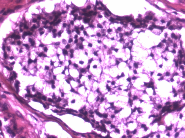 按照胃肠胰腺神经内分泌肿瘤WHO2010分类,该例应属于NET G1(神经内分泌瘤,1级)。需标记Syn, CgA, Ki67.