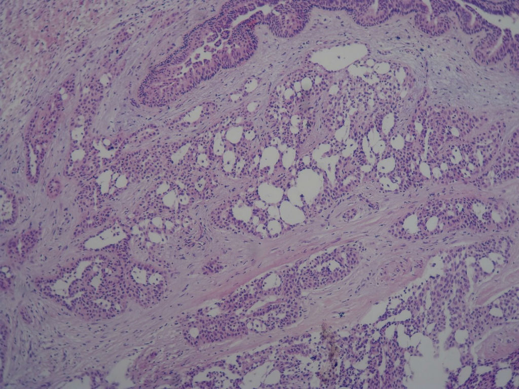 癌是以侵袭性生长和复发转移为特征的,镜下表现为组织结构的紊乱、细胞的异型性,乳腺冰冻病理的诊断要从大体、镜下组织学表现、细胞形态等方面做出综合判断。组织学形态着重看有无正常结构的消失、是否存在浸润性生长的特征,本例冰冻中看不到小叶结构特征,腺管大小、排列比较杂乱。部分不规则的小腺体围绕正常导管生长,这是否应是浸润的一种表现。细胞学上冰冻切片的细胞异型的判断一般认为是不可靠的,但在切片质量较好,有内对照的参考标尺下还是可以判读的,正常的导管上皮是一把可以利用的标尺。这一例我们结合病人年龄、大体、镜下表现术中报癌了,上级医院会诊标记肌上皮已证实是癌,以后会把相关免疫组化补上。但现在想来这例报癌风险还是很大的,有点后怕,以后在遇到可能会后退一步,也许是不认识类似的硬化性腺病吧,当时做术中诊断有点应了一句话:无知者无畏。