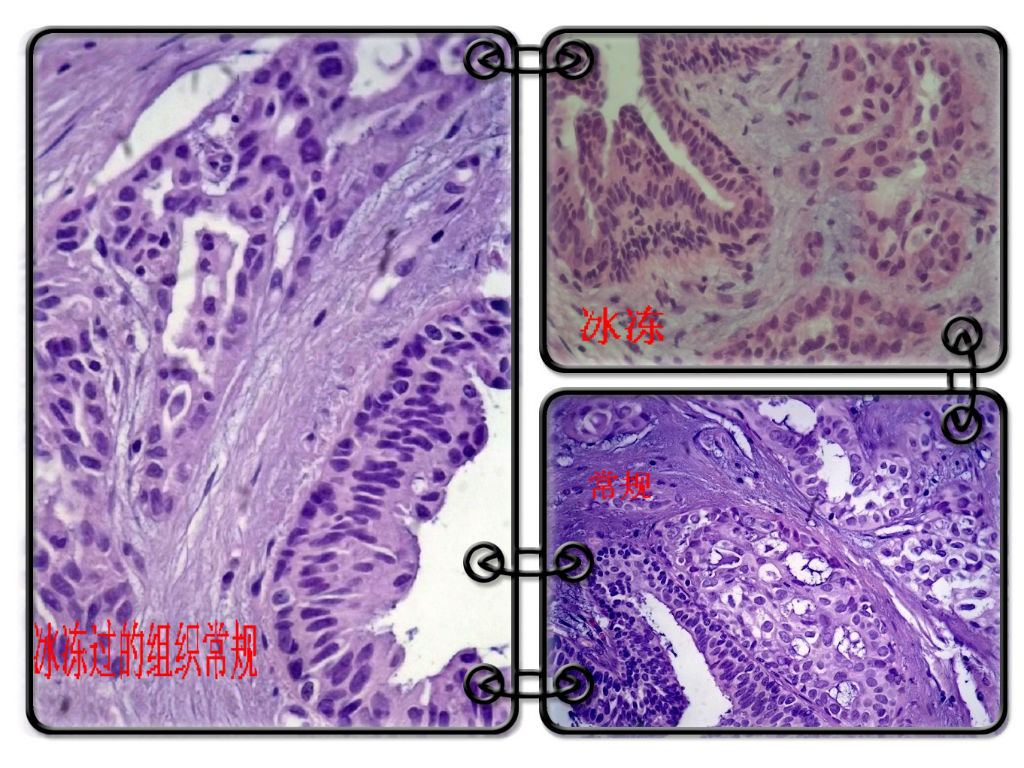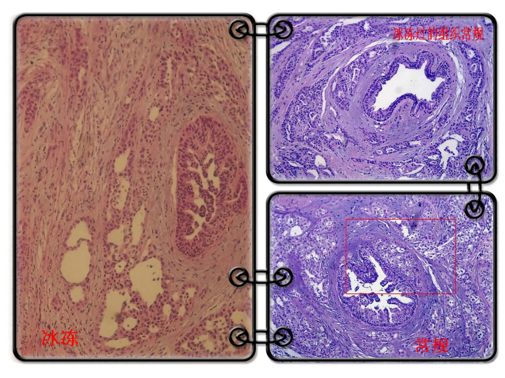 The way of frozen for breast lesions is too old and 落后了。中国病理的发展和城市大楼的建设真是不成比例呀。