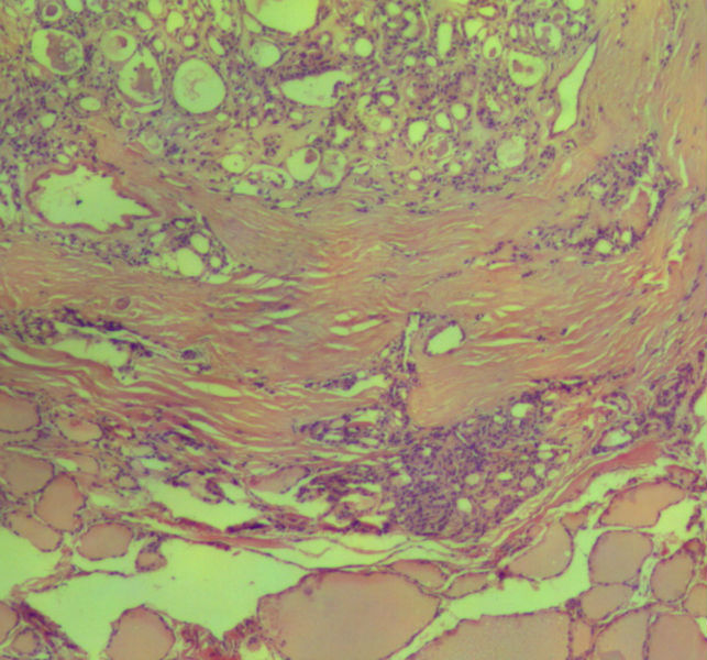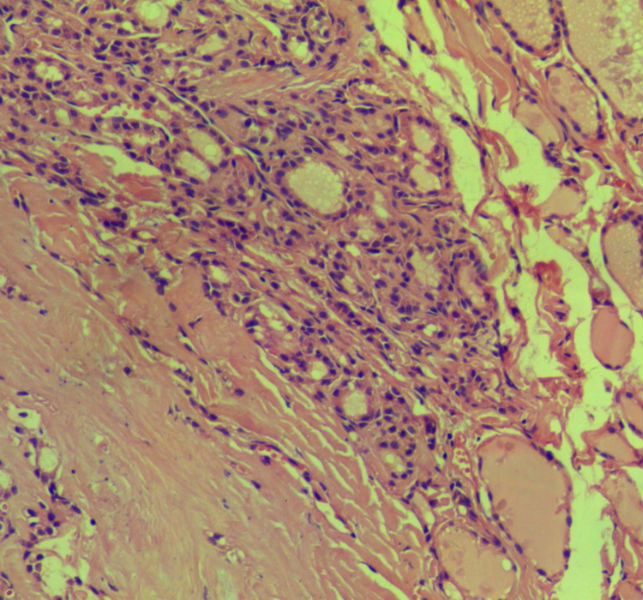 女,45岁,体检发现颈前区一结节,术中送检甲状腺左腺叶,发现一界清结小1*0.8cm,灰黄色。术中诊断滤泡性肿瘤伴包膜累及,局部疑包膜穿破,滤泡癌可能,待石蜡报告。石蜡连续切片形态见图,可见明显包膜穿破,诊断为滤泡性癌。患者借片到上级医院会诊,结果为:包膜内滤泡癌伴包膜累及。请问有包膜内滤泡癌的提法吗?这个病例怎么诊断啊?请各位老师多指导。