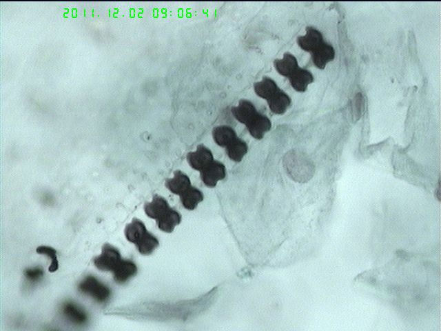后两幅是高倍视野照的,我们显微镜镜高倍视野的视场是0.2平方毫米,对应的直径是0.5MM,如果是刷毛脱落的纤维丝不至于这么小吧,会是什么微生物吗?