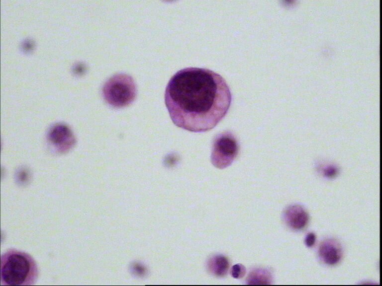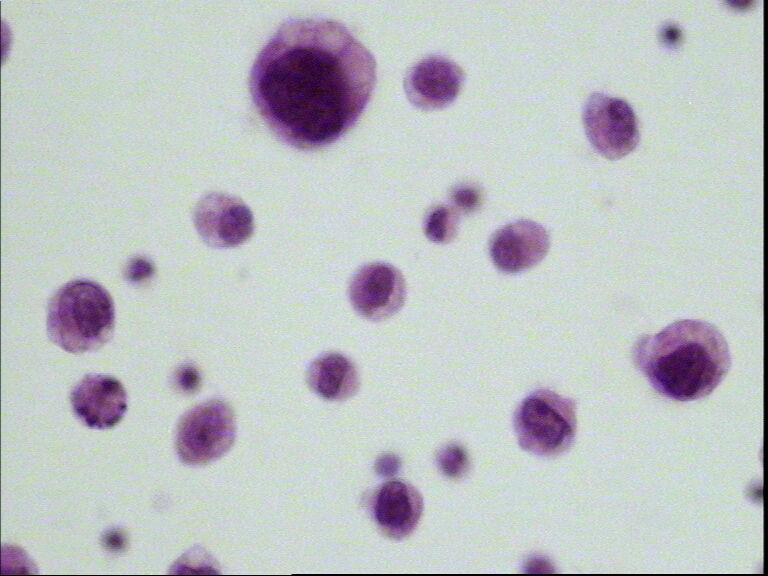 涂片中可见淋巴细胞、中性粒细胞及间皮细胞,个别核大深染的细胞是增生的间皮细胞,不是癌细胞,这种细胞很容易和癌细胞混淆,下诊断时一定要加小心。