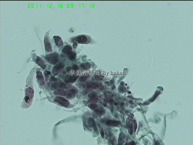 细胞显著异型,梭形,蝌蚪形,细胞平铺,倾向鳞癌。