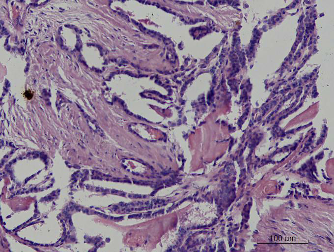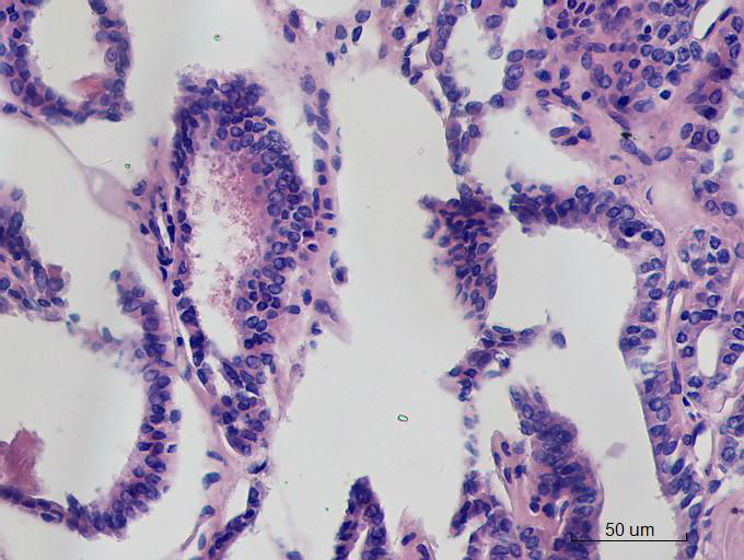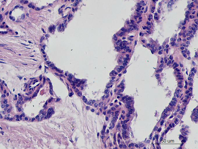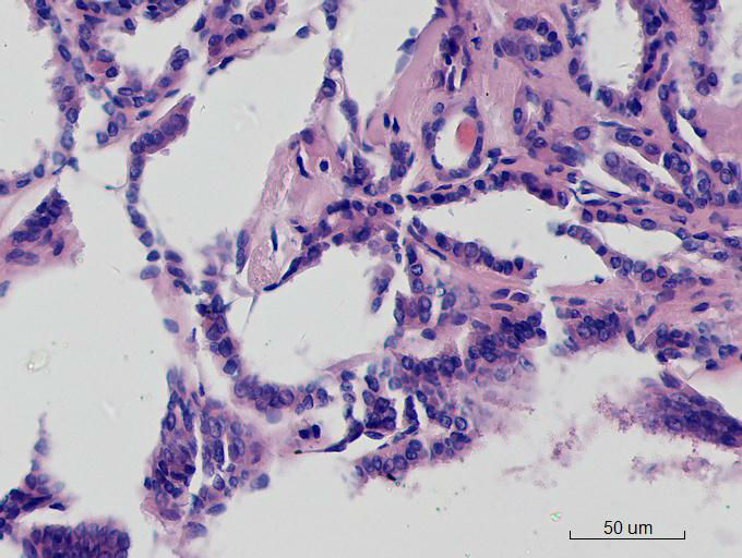 就目前的切片看本例没有形成明确的以纤维结缔组织为轴心的乳头结构,前15张图更是连乳头状癌特有的核的表现(核拥挤、核沟、核内假包含体、毛玻璃核等)也不明显,而后传的7张图中核的改变都比前15张图中要明显,个人绝得诊断乳头状癌缺乏重要依据(1)明确的乳头结构(2)核拥挤、核沟、核内假包含体、毛玻璃核,所以希望重取材,多切片搜索可靠的诊断依据再下结论。