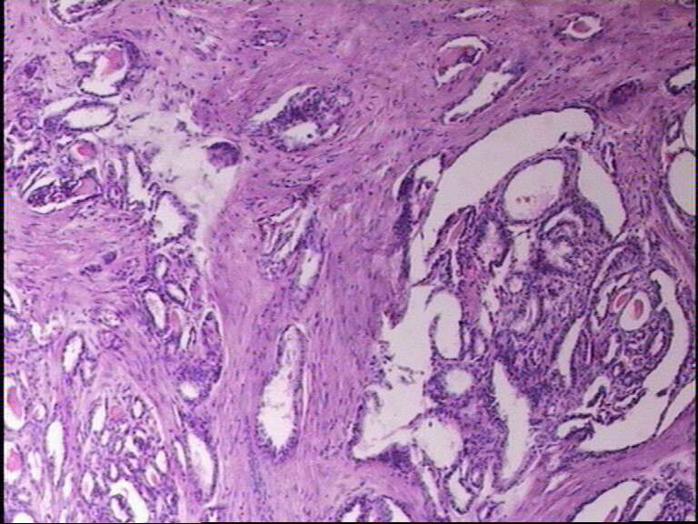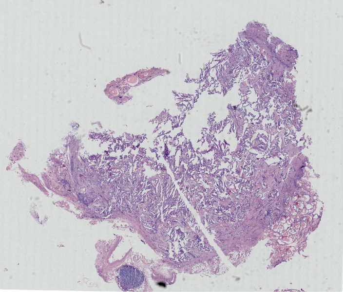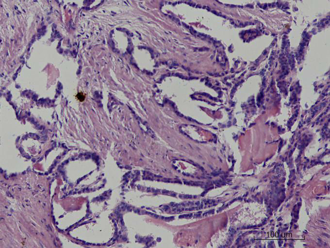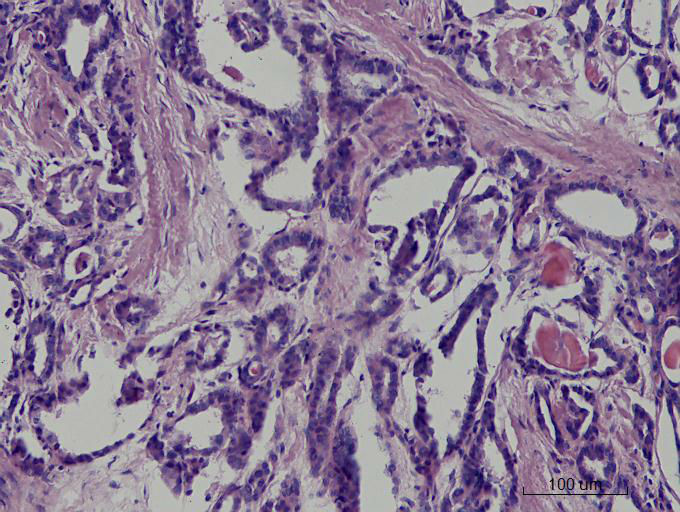 就目前的切片看本例没有形成明确的以纤维结缔组织为轴心的乳头结构,前15张图更是连乳头状癌特有的核的表现(核拥挤、核沟、核内假包含体、毛玻璃核等)也不明显,而后传的7张图中核的改变都比前15张图中要明显,个人绝得诊断乳头状癌缺乏重要依据(1)明确的乳头结构(2)核拥挤、核沟、核内假包含体、毛玻璃核,所以希望重取材,多切片搜索可靠的诊断依据再下结论。