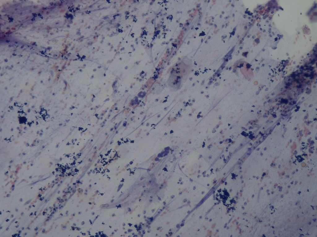 少量不能下诊断的细胞,部分裸核,免疫母副免疫母可能!未见明显恶性肿瘤细胞,如临床怀疑,继续送检并多涂片~~~