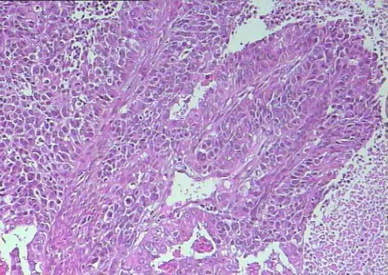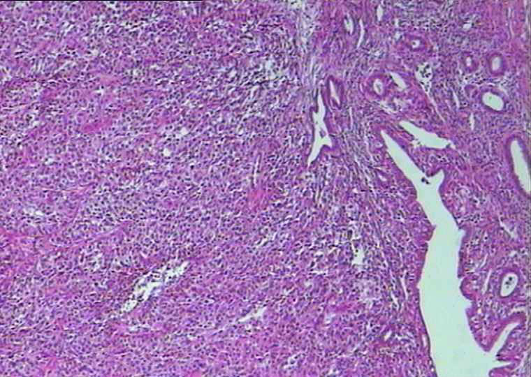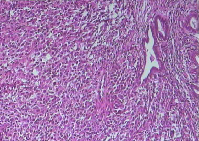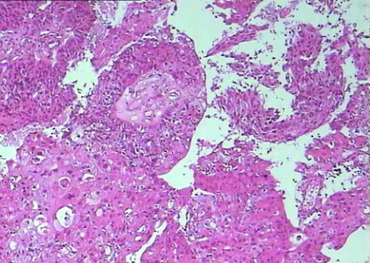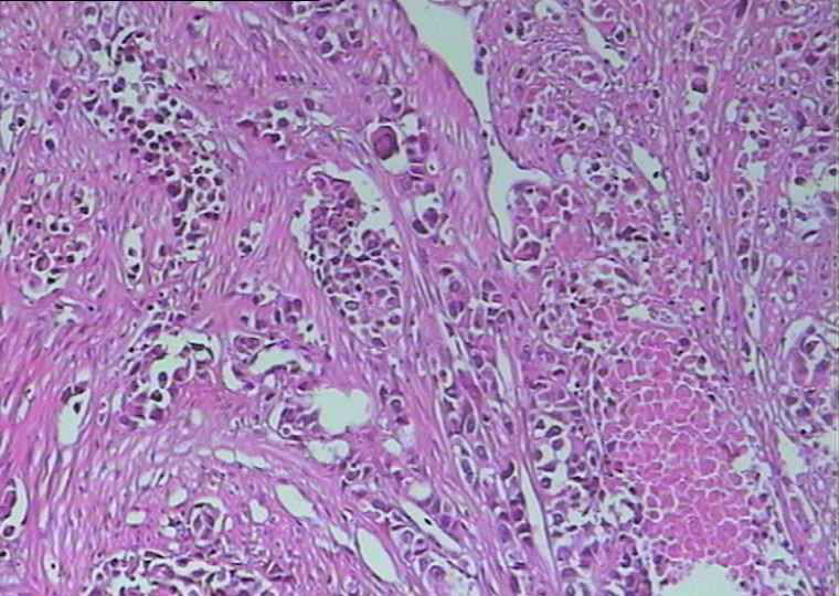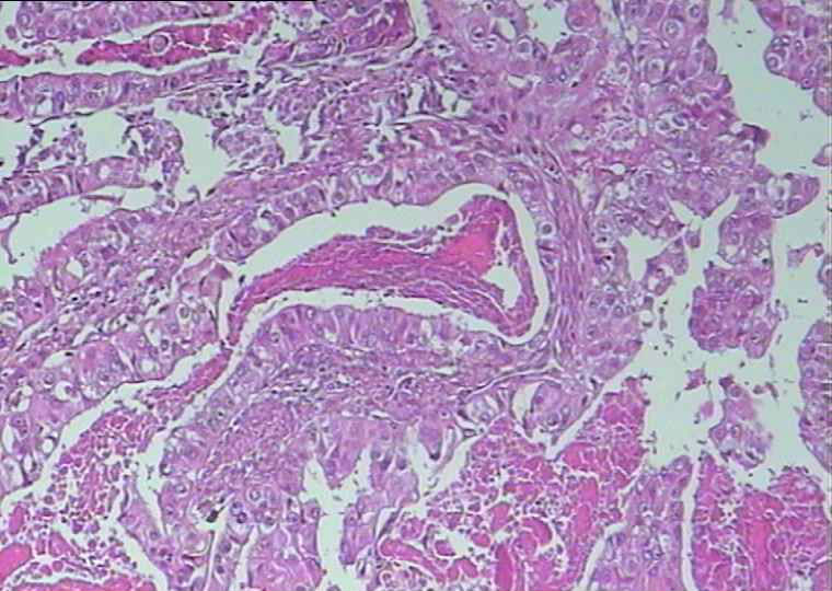 宫腔内淡黄色隆起型肿物数枚,实性质软,直径1.5~3cm,其一侵及浆膜面,肿物累及颈管及一侧输卵管,卵巢,并在输卵管膨大处形成直径0.5cm淡黄色菜花样肿物。